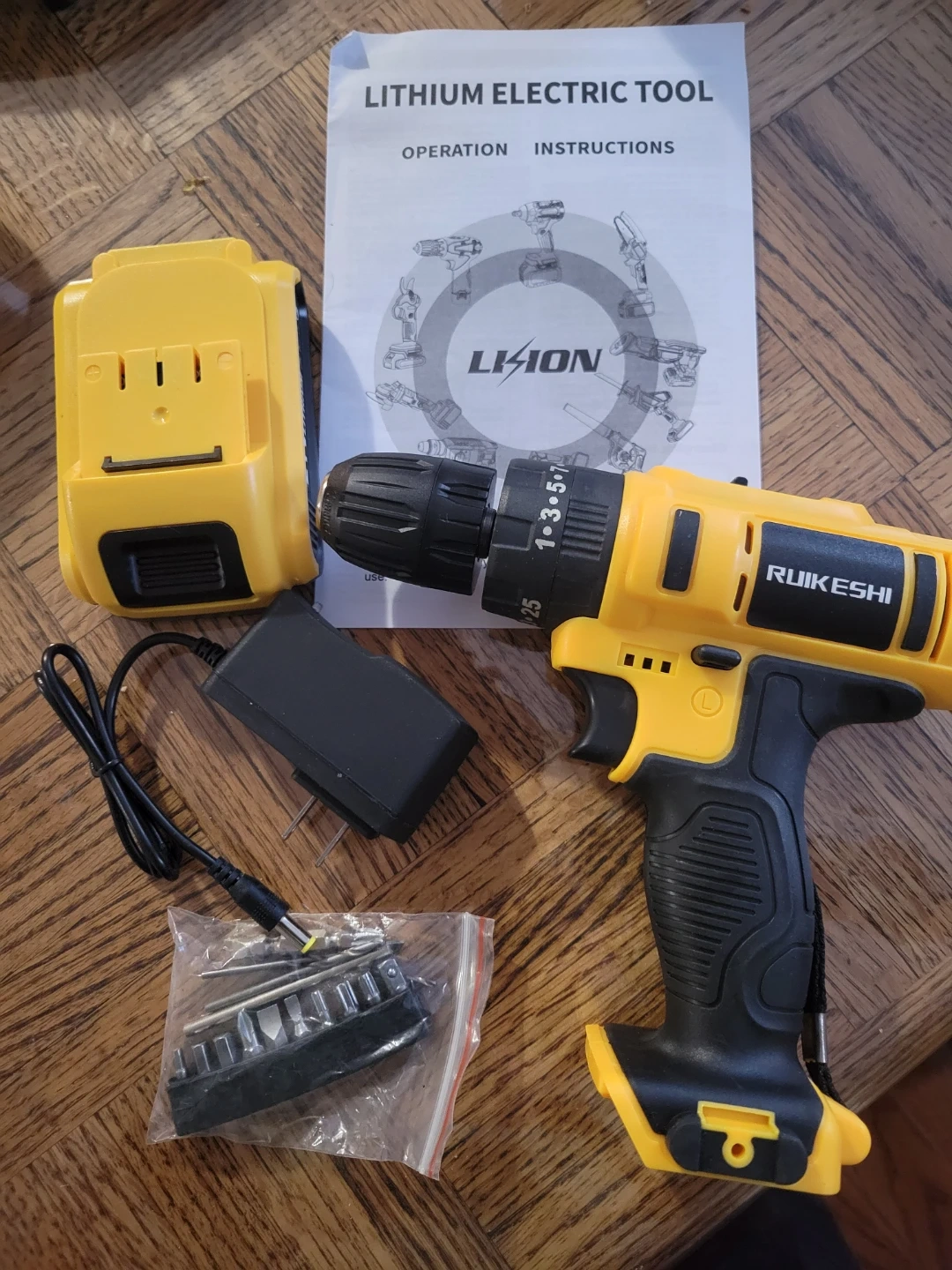 This is a RUIKESHI brand lithium electric hammer drill. It comes with a battery, charger, and a bit set that includes drill bits and screwdriver bits.