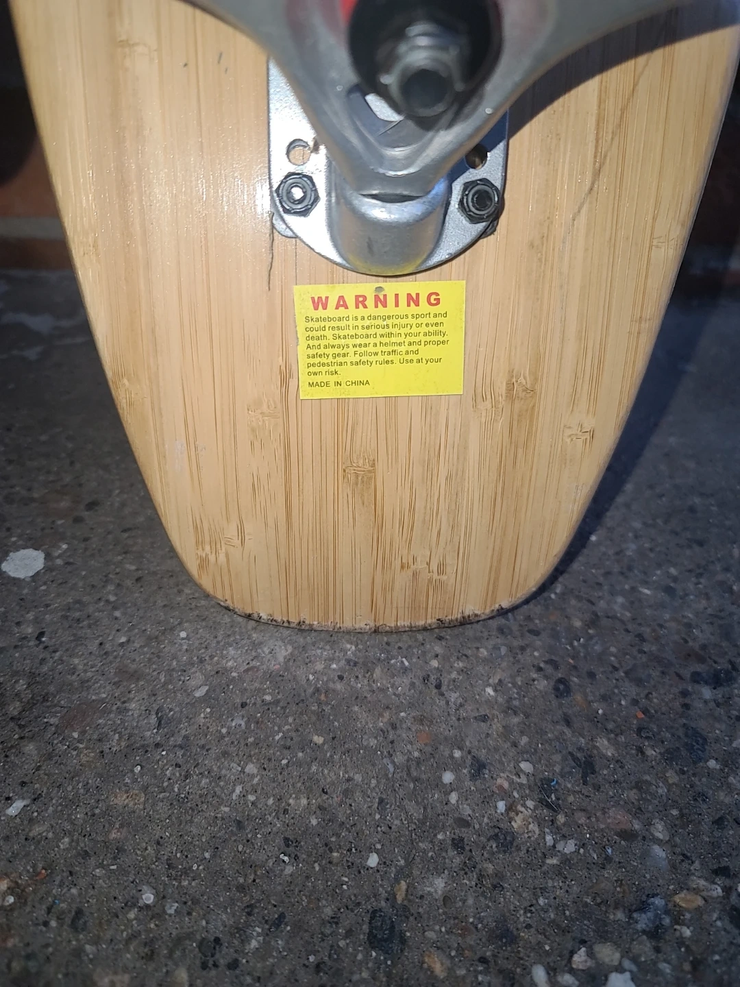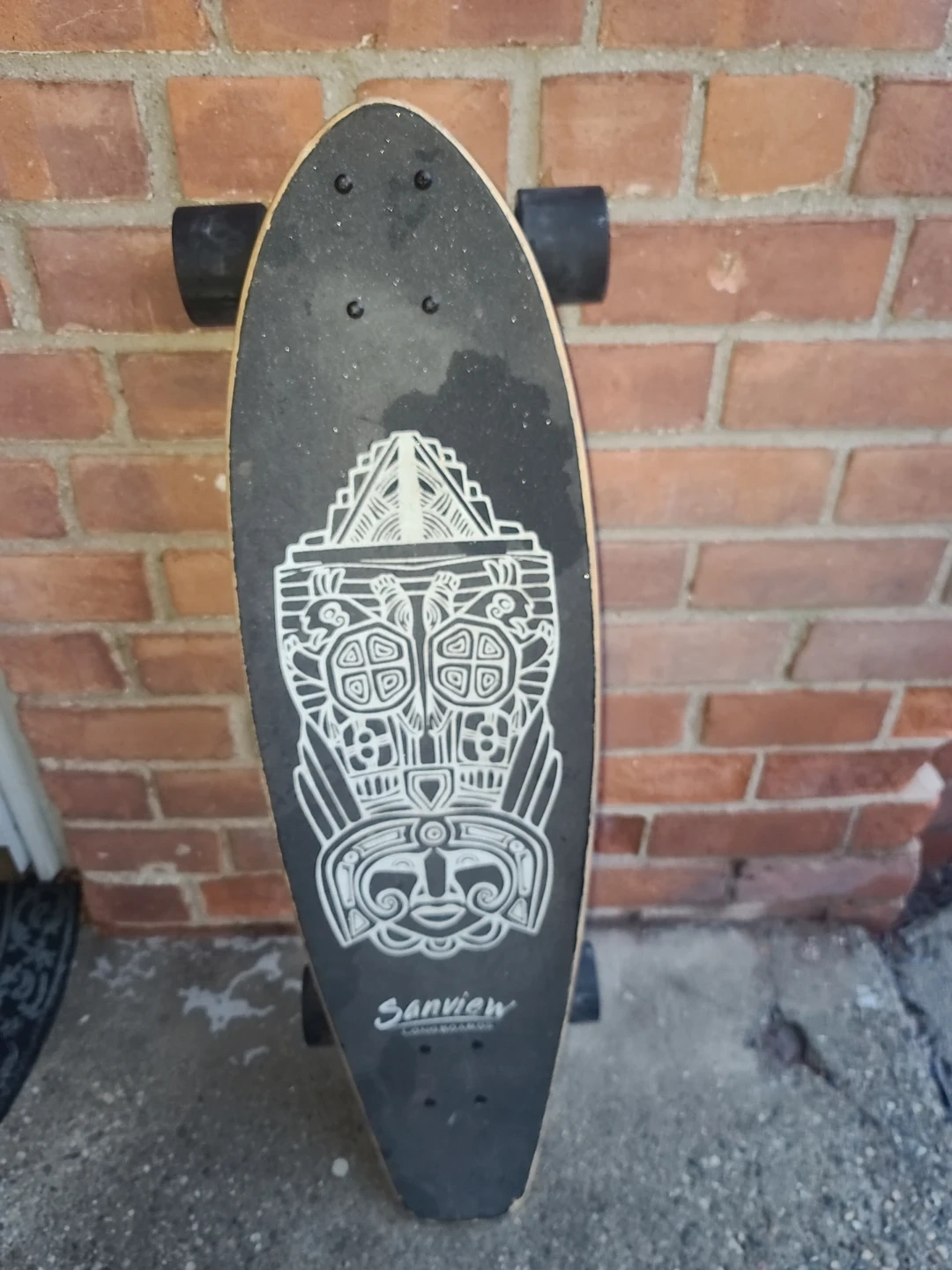 This Sanview longboard features a wooden deck with a cool tribal graphic. It has black wheels and silver trucks. Ready to ride!