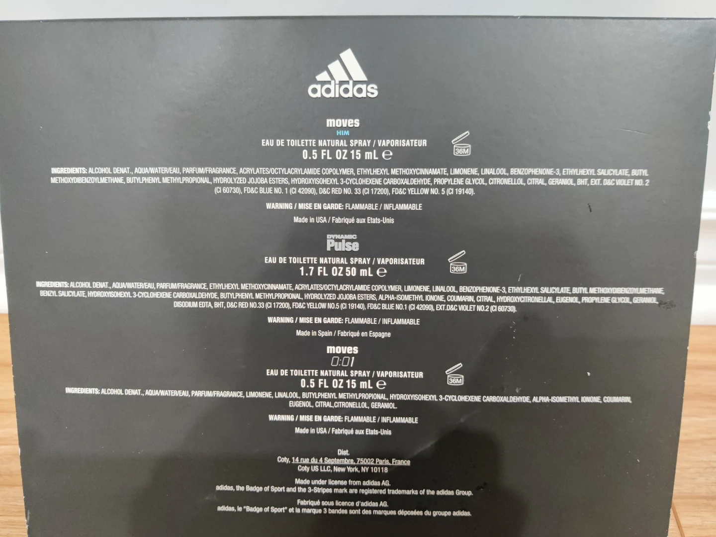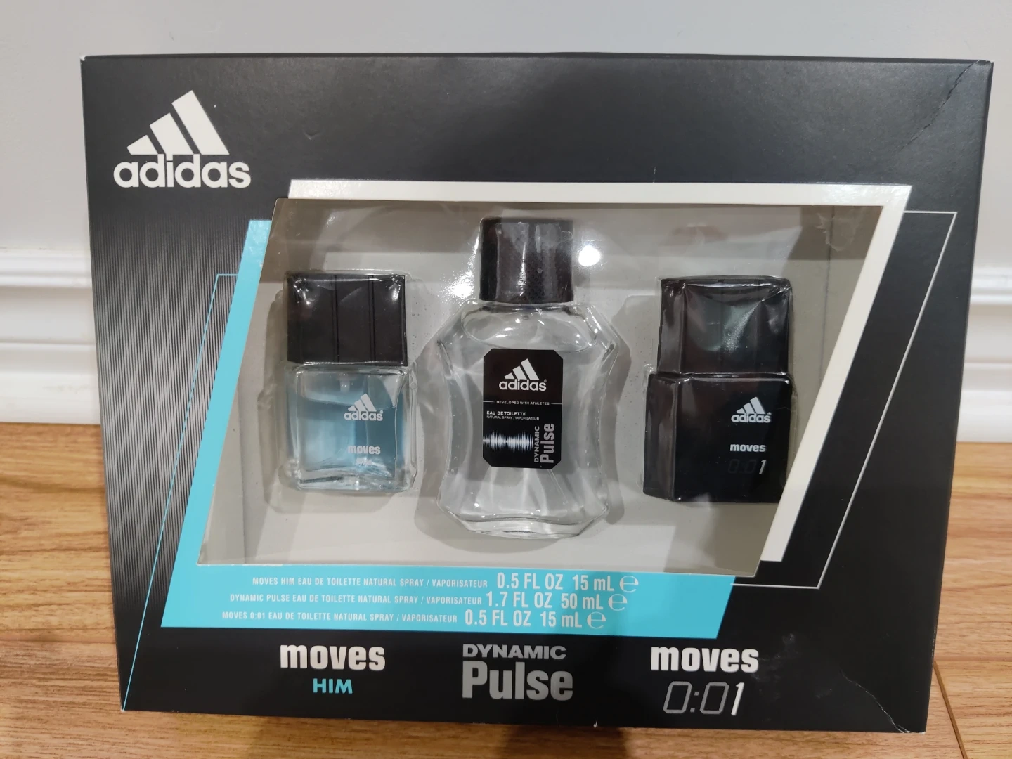 Selling a brand new Adidas cologne set! The set includes three different scents: Moves Him, Dynamic Pulse, and Moves 0:01. Each cologne is in its original packaging and has never been used. The set contains 0.5 FL OZ (15 mL) of Moves Him and Moves 0:01, and 1.7 FL OZ (50 mL) of Dynamic Pulse.