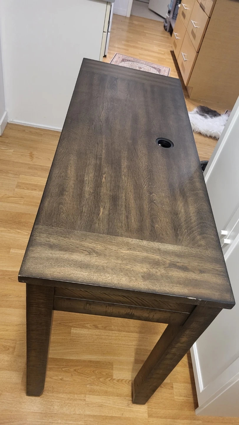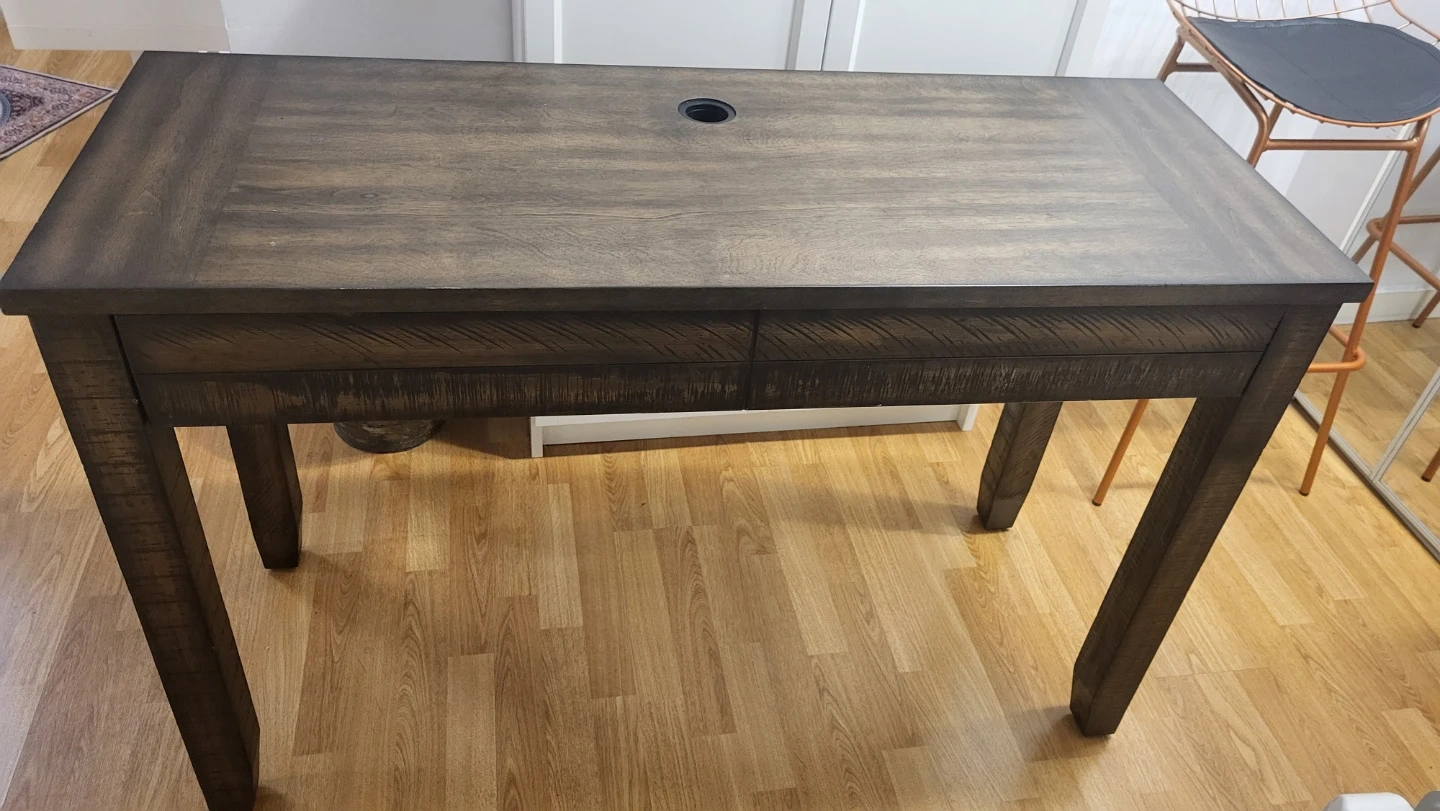 This dark wood desk features a convenient cable management hole on the surface. It has two drawers for storage, perfect for keeping your workspace tidy. The distressed wood finish gives it a rustic look.