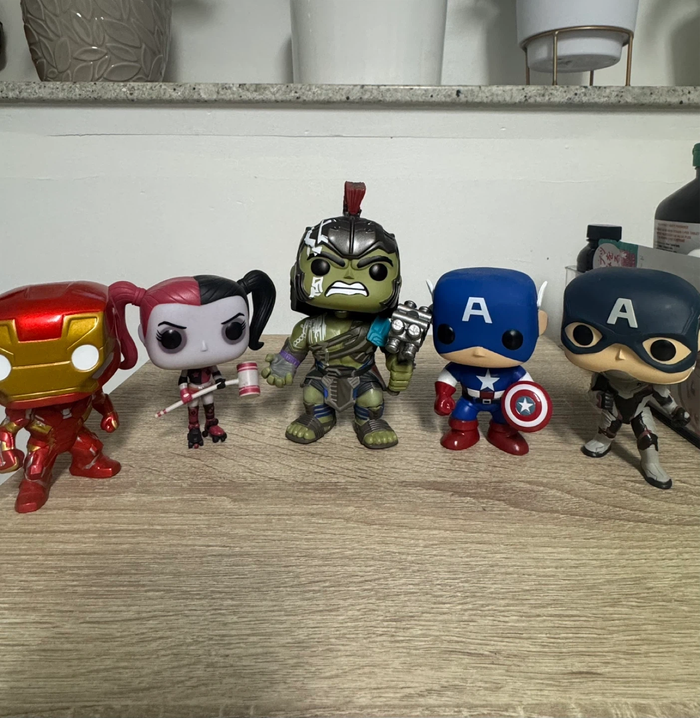 Collection of five Funko Pop! figures featuring Iron Man, Harley Quinn, Thor Ragnarok Hulk, Captain America, and a Marvel character. These vinyl figures are great for display.