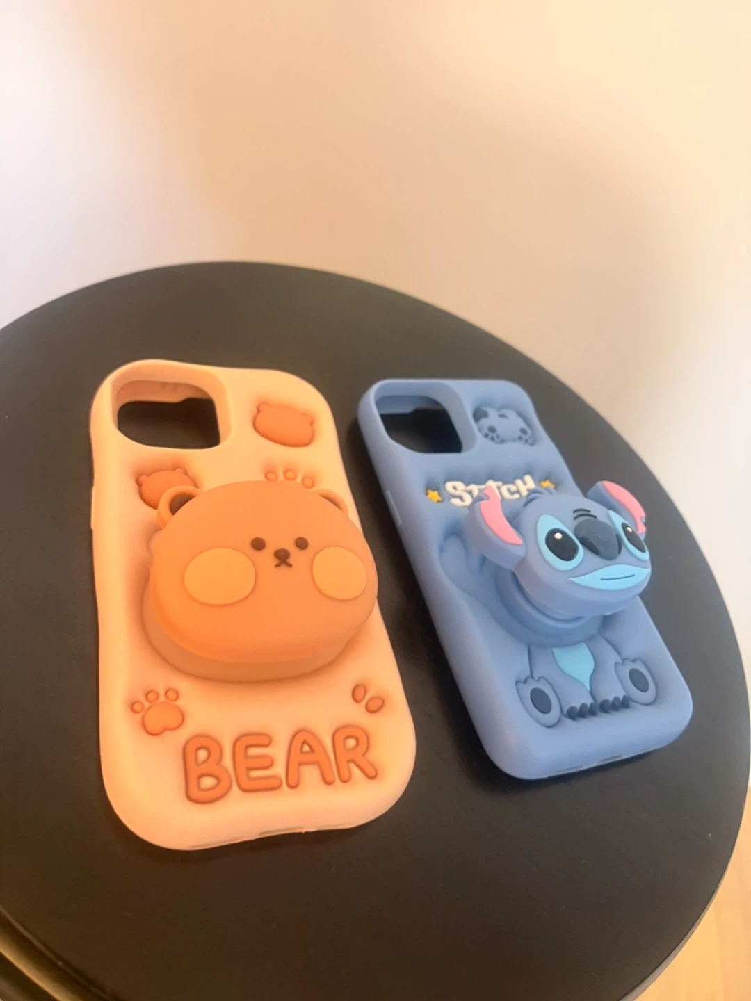 Adorable phone cases featuring a brown bear and Stitch! Soft silicone material, and the heads are pop sockets, for good grip. Protect your phone with some fun!