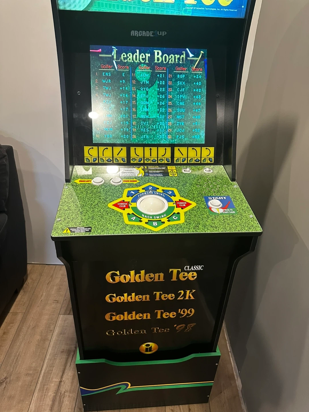 This is an Arcade1Up Golden Tee cabinet with riser. It includes multiple Golden Tee games. This cabinet is perfect for any golf enthusiast or arcade game collector! Great condition. Everything works great!