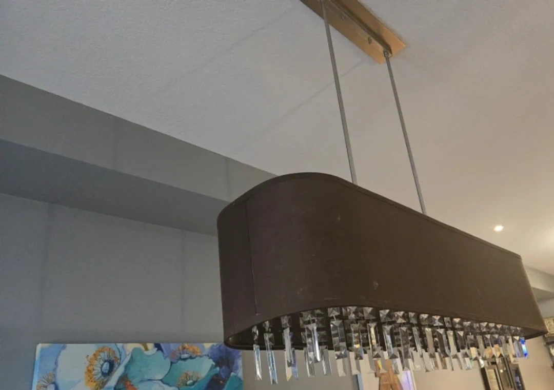 A pretty light brown satin shade with crystals - rectangular in excellent condition great over a diningroom table or long Island in kitchen.