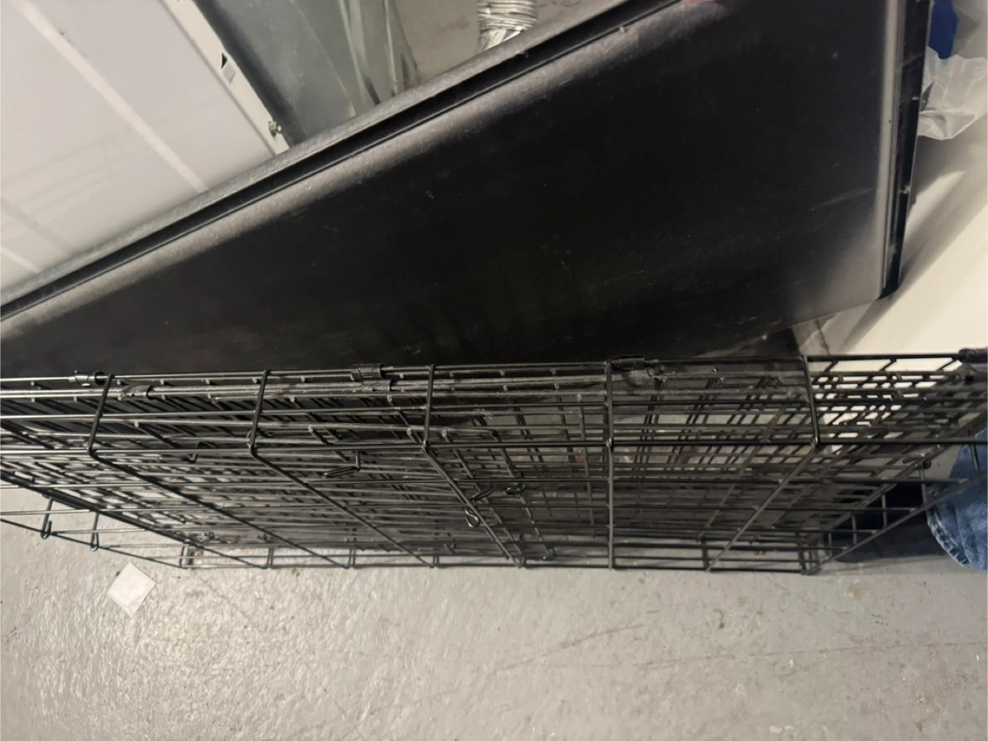 This is a wire cat crate with a black plastic bottom tray. It's a sturdy and reliable option for housing your pet. The tray makes cleaning up easy!