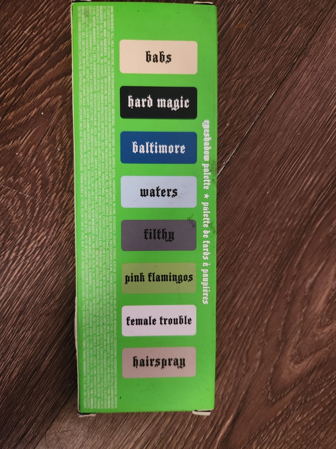 This Kat Von D Divine eyeshadow palette includes the shades Babs, Hard Magic, Baltimore, Waters, Filthy, Pink Flamingos, Female Trouble, and Hairspray. It's an eyeshadow palette with a net weight of 8.2g (0.29 oz).