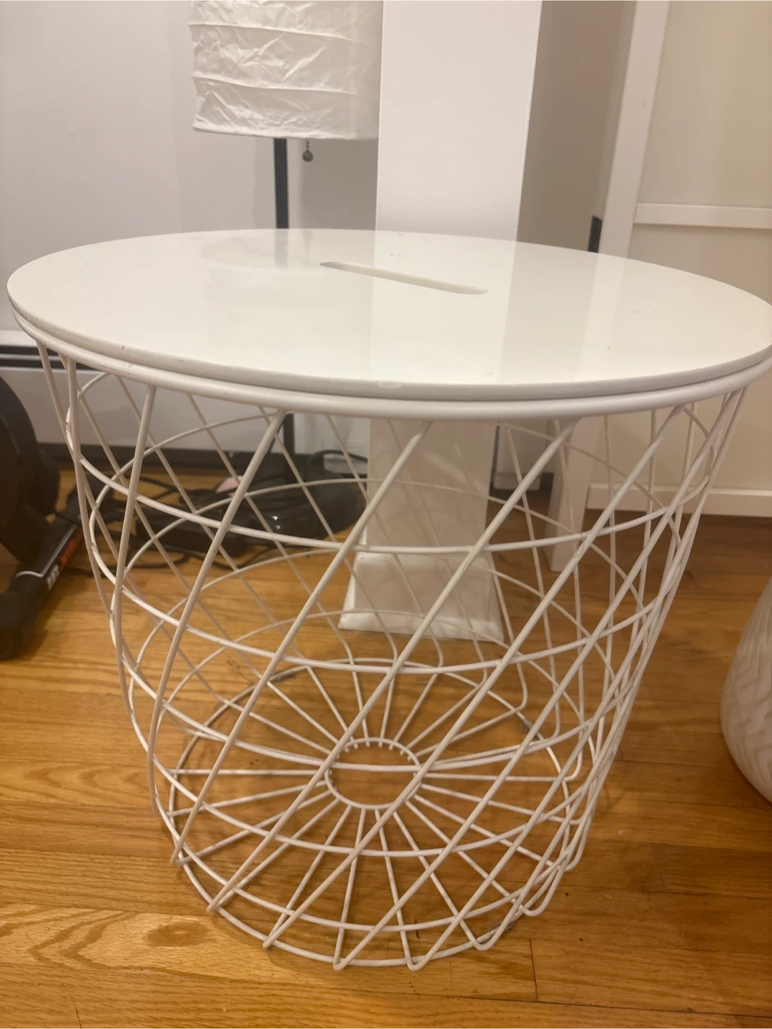 White wire storage basket with a top that can be used as a side table piece for stashing blankets or magazines. Useful for small spaces!