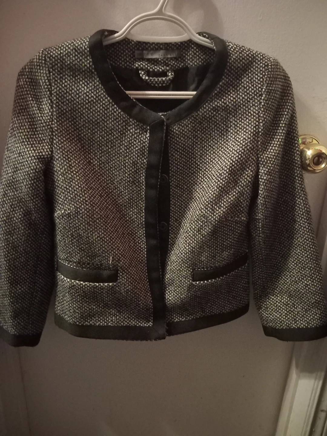 This is a stylish Zara Basic women's blazer. It's a textured with a black trim and button-front closure. Material blend for comfort and structure.