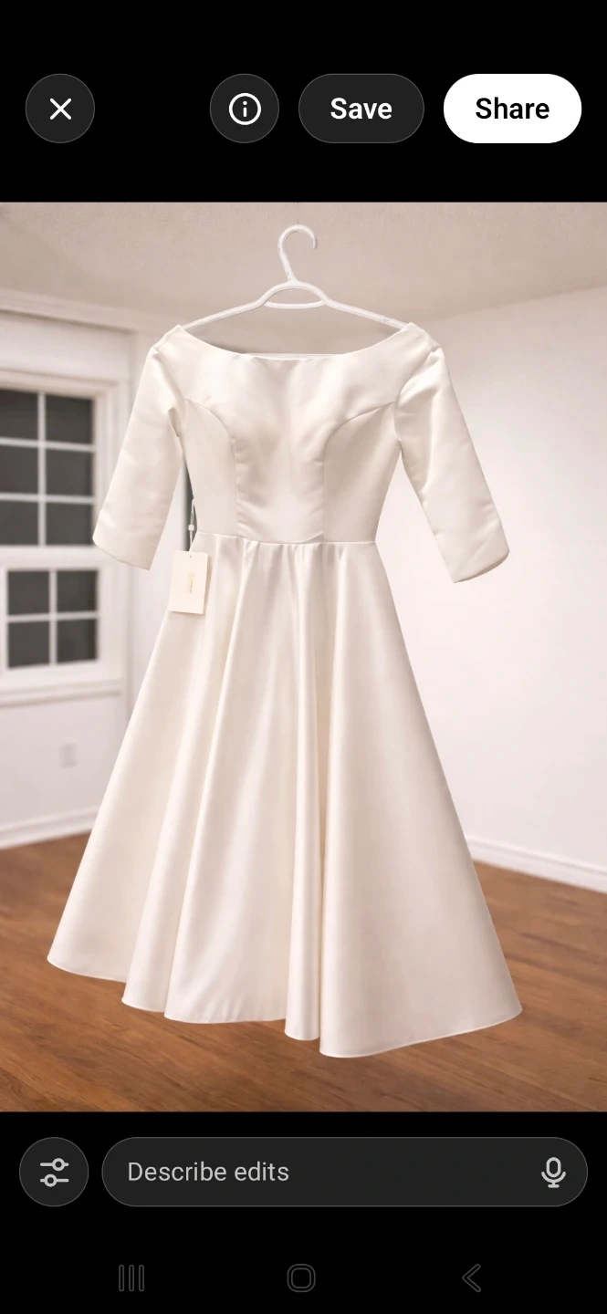 This elegant white satin dress features a flattering A-line silhouette and three-quarter sleeves. It's perfect for special occasions and has a timeless style.