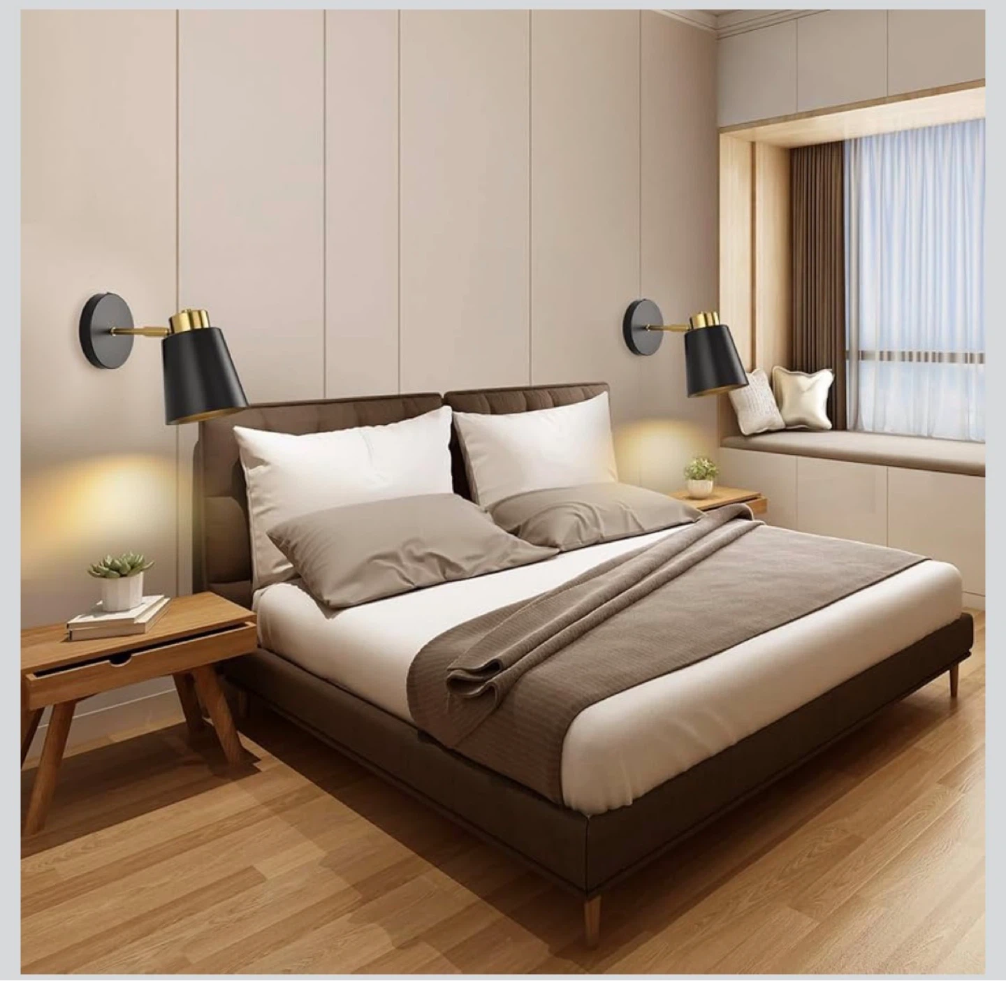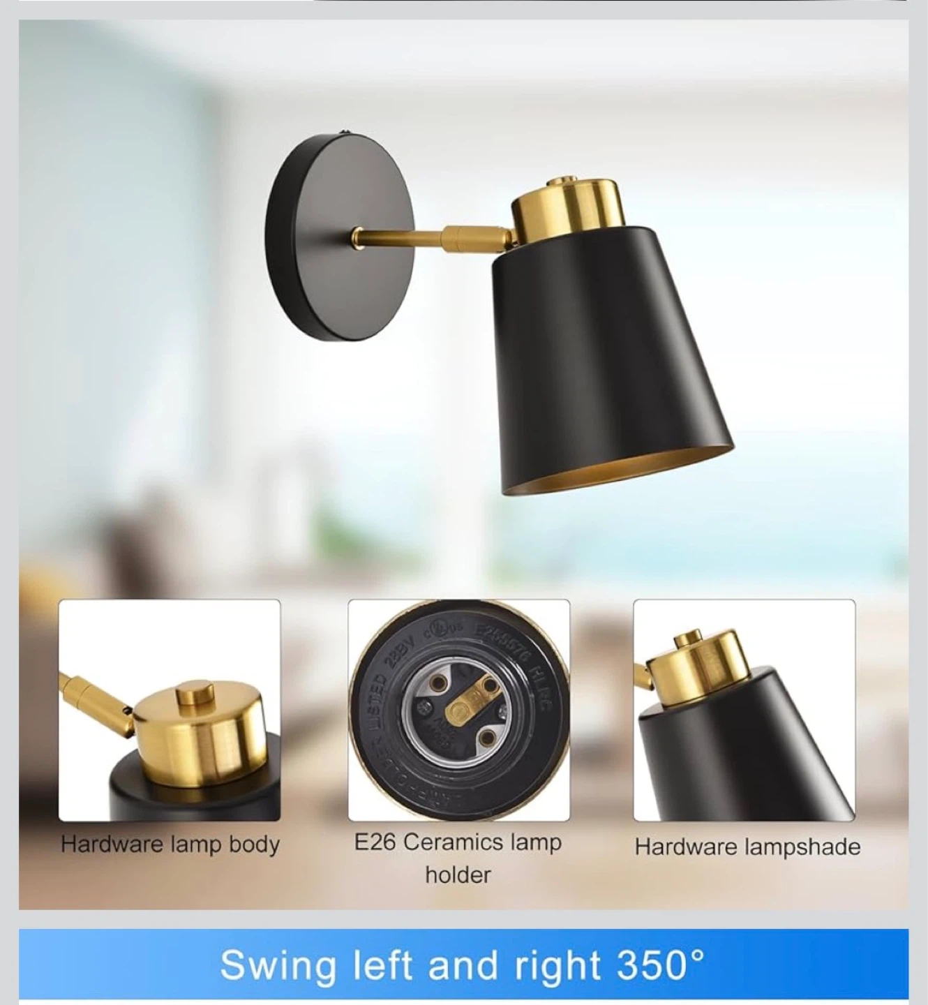 This modern wall sconce features a black conical shade with a gold interior and brass hardware. It's designed with an E26 ceramic lamp holder and offers 350° swing adjustability. It's great for adding accent lighting in bedrooms or hallways!
