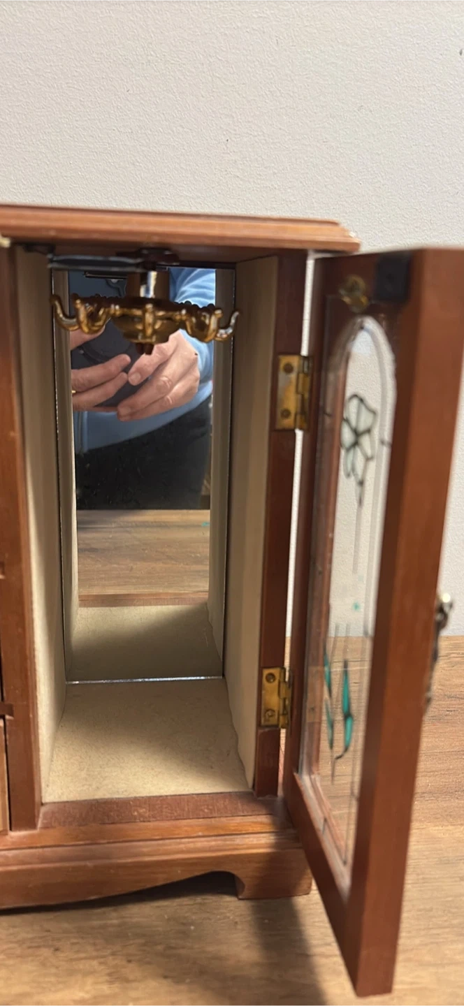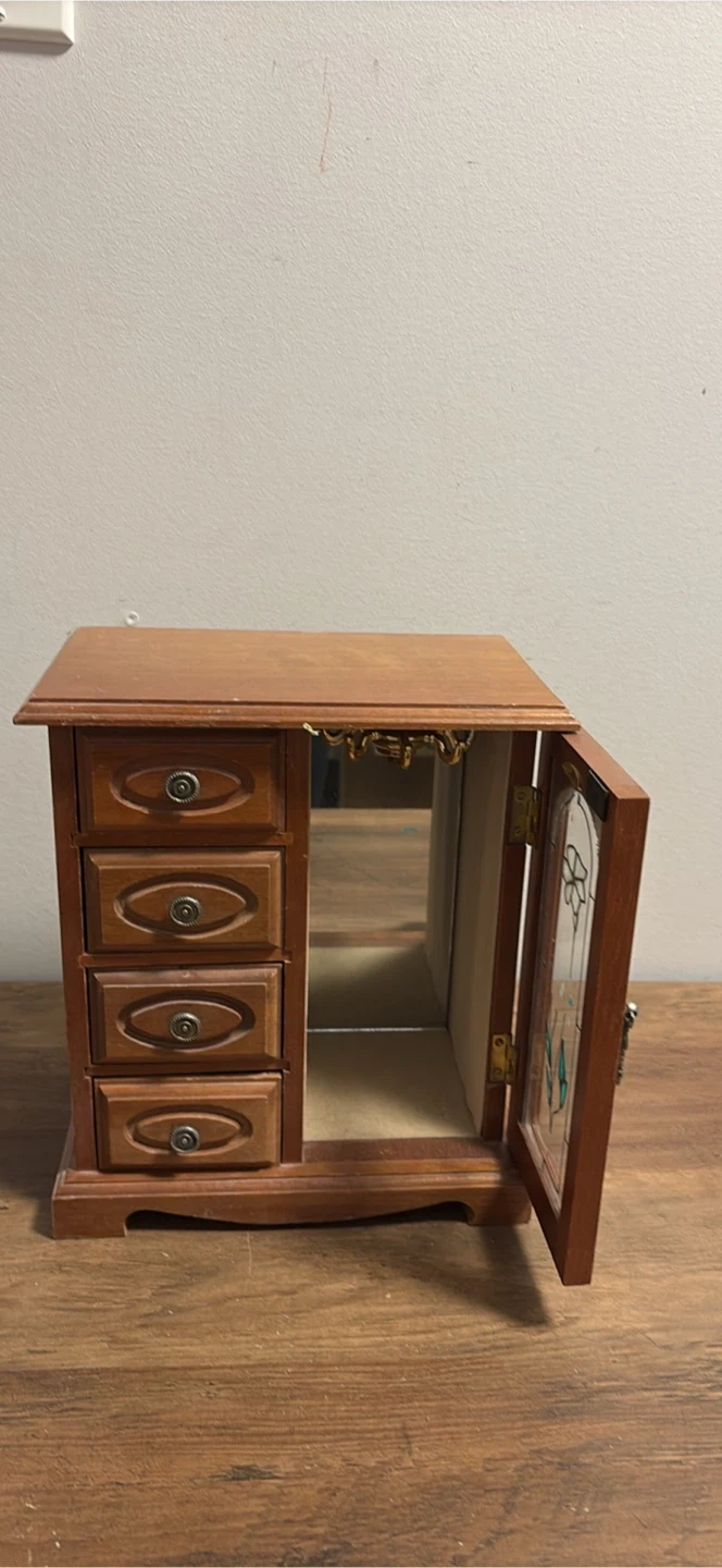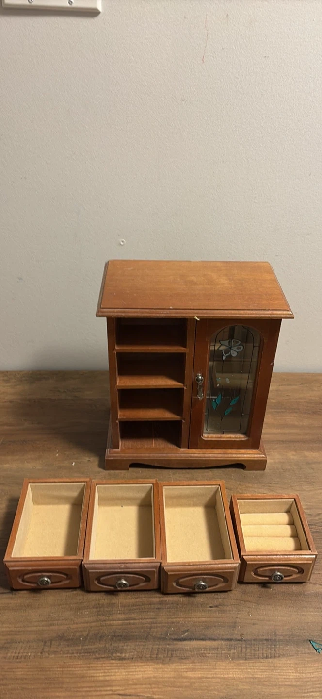 This wooden jewelry box features four pull-out drawers for storage. It also has a single door with a decorative stained glass panel and hooks inside. The interior is lined with a soft fabric. It's a lovely piece for organizing your accessories!