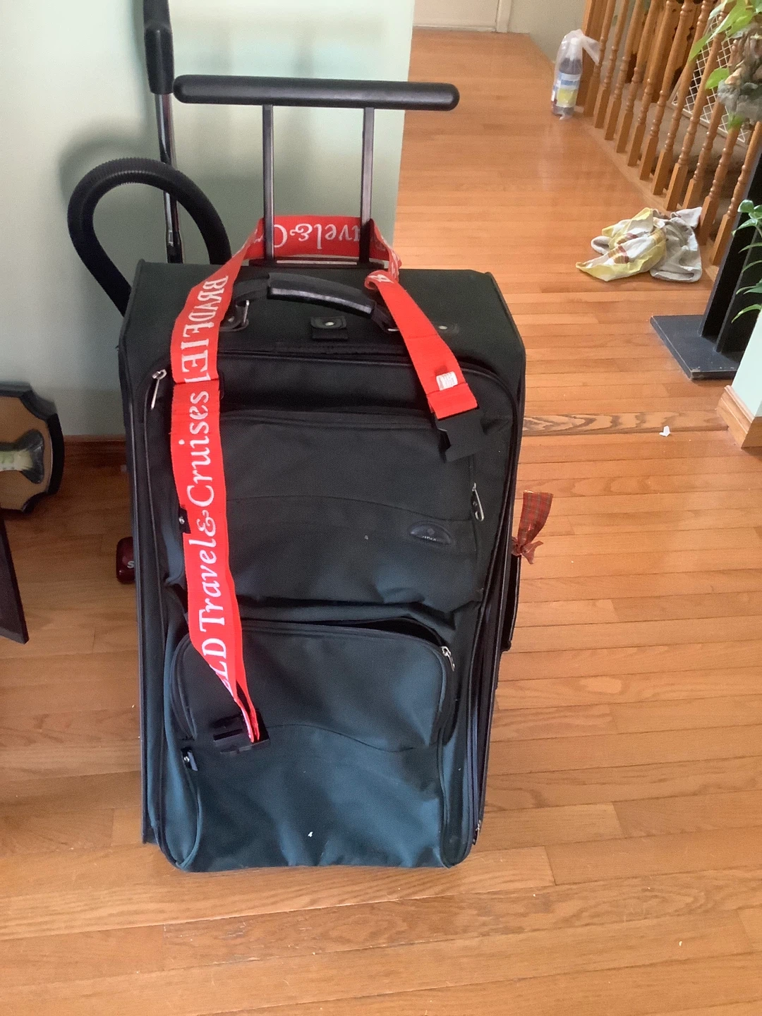 Black Rolling Suitcase with Red "WORLD TRAVEL & CRUISES" Strap