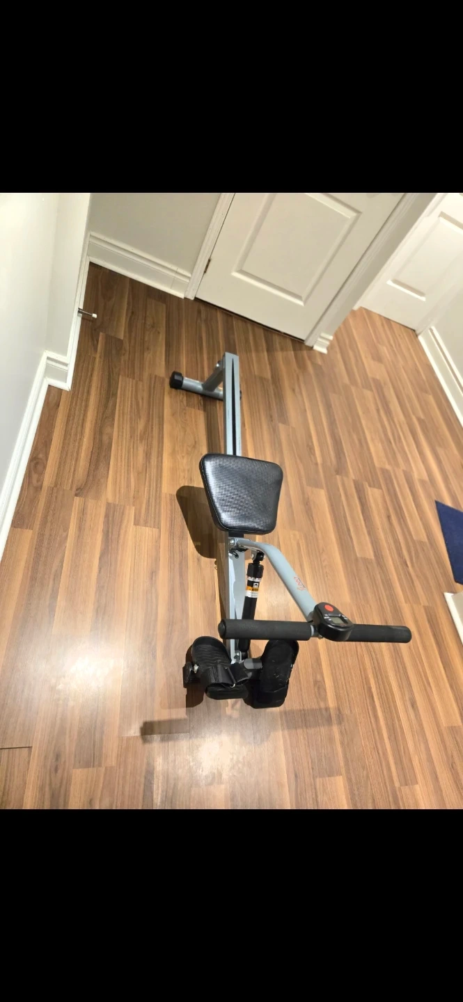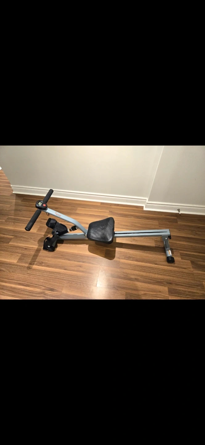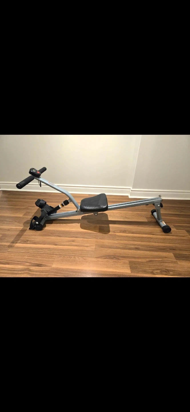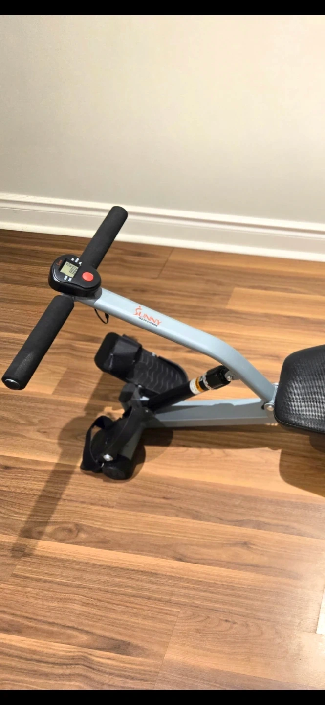 Selling a Sunny Health & Fitness rowing machine in good condition. Great for getting a full-body workout at home. The machine is grey with a black seat and footrests. It features a digital monitor to track your progress. Perfect for anyone looking to add a cardio workout to their routine