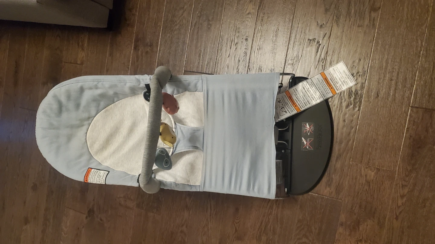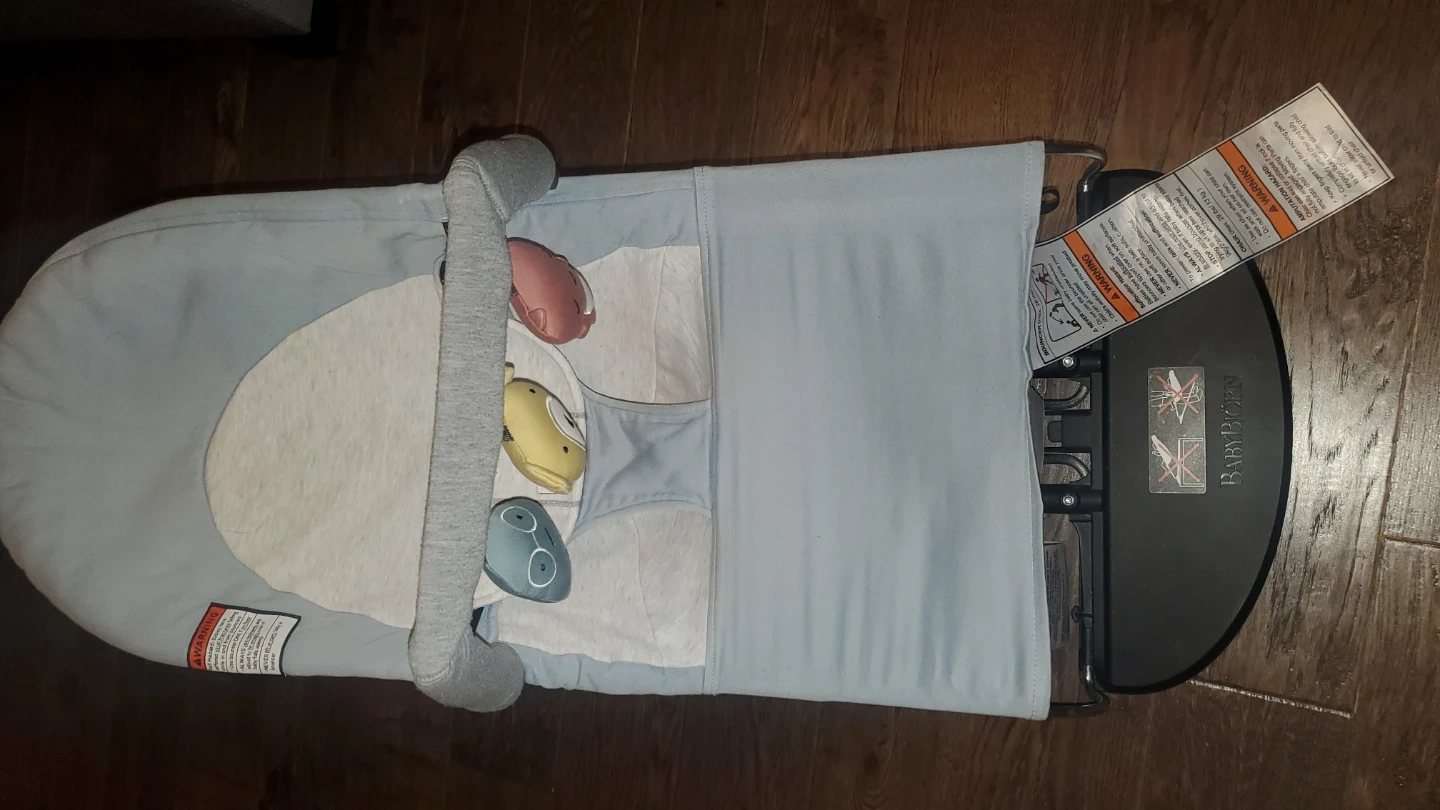 BabyBjörn Bouncer Balance Soft in a light blue fabric. It's designed for infants up to 2 years old and has a playful toy bar attached. The fabric is soft and washable, providing comfort for your little one.