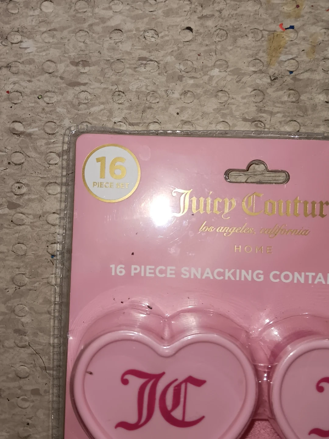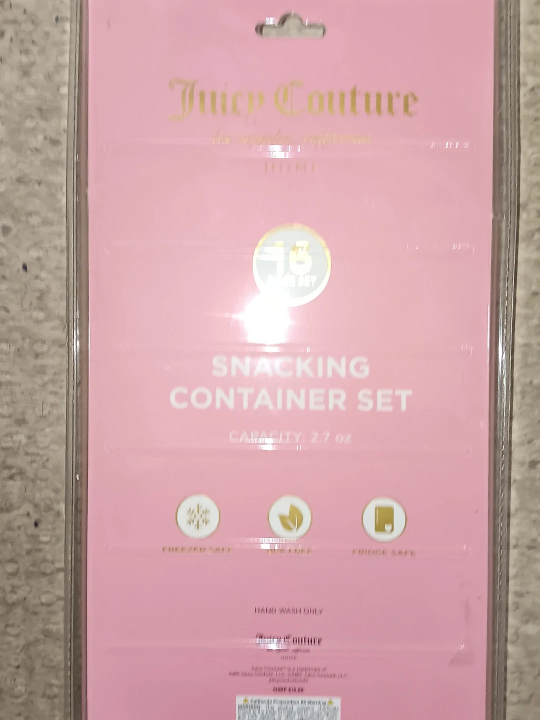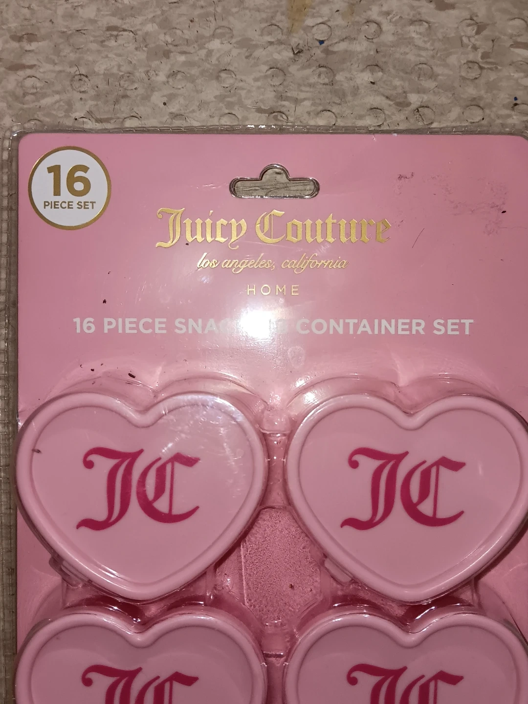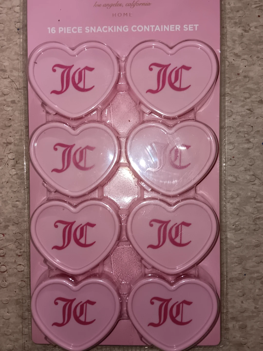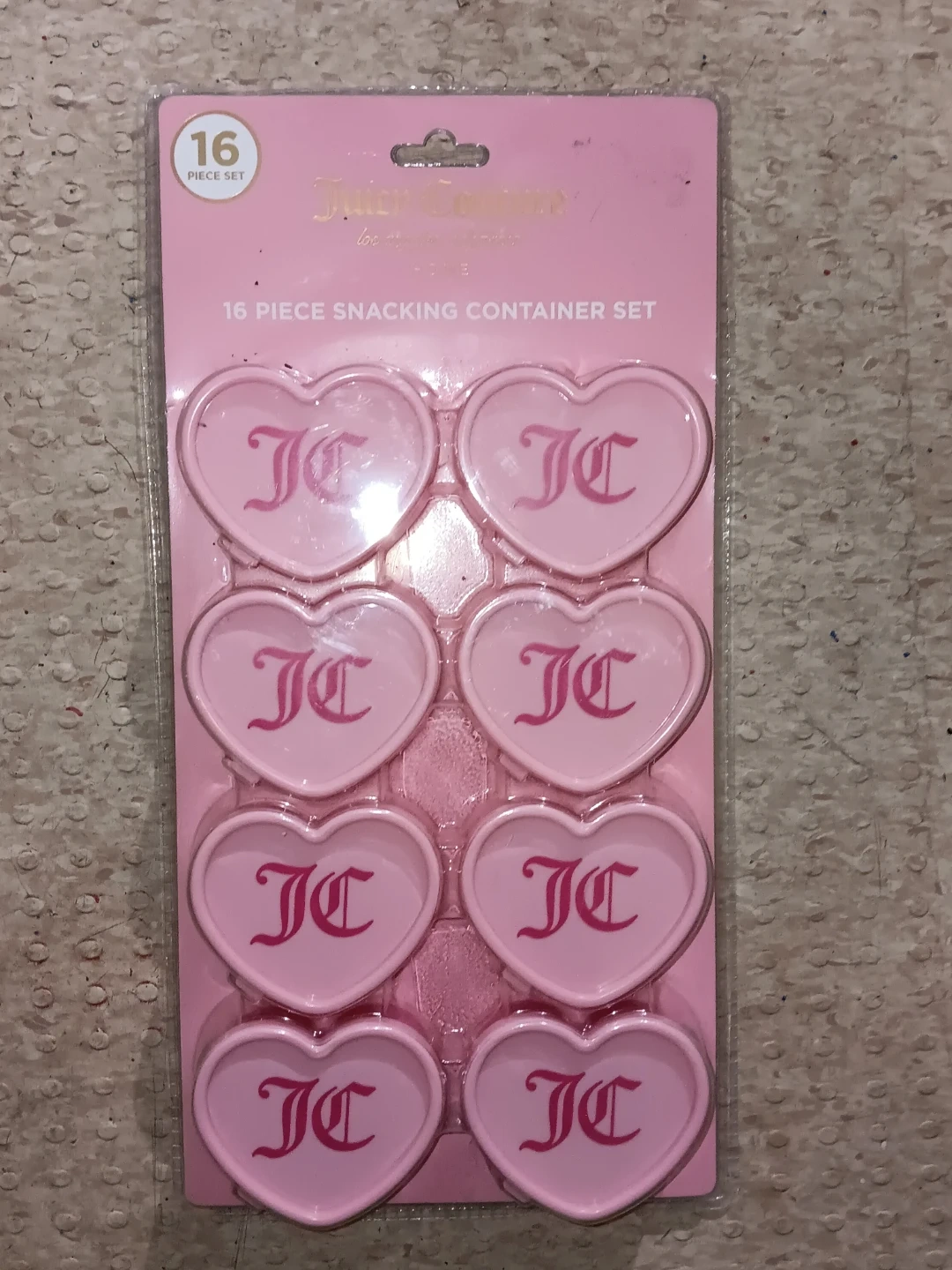 This is a 16 piece snacking container set from Juicy Couture Home. The containers are heart-shaped and pink with the JC logo. Each container has a capacity of 2.7 oz. They are freezer safe and fridge safe. Hand wash only.