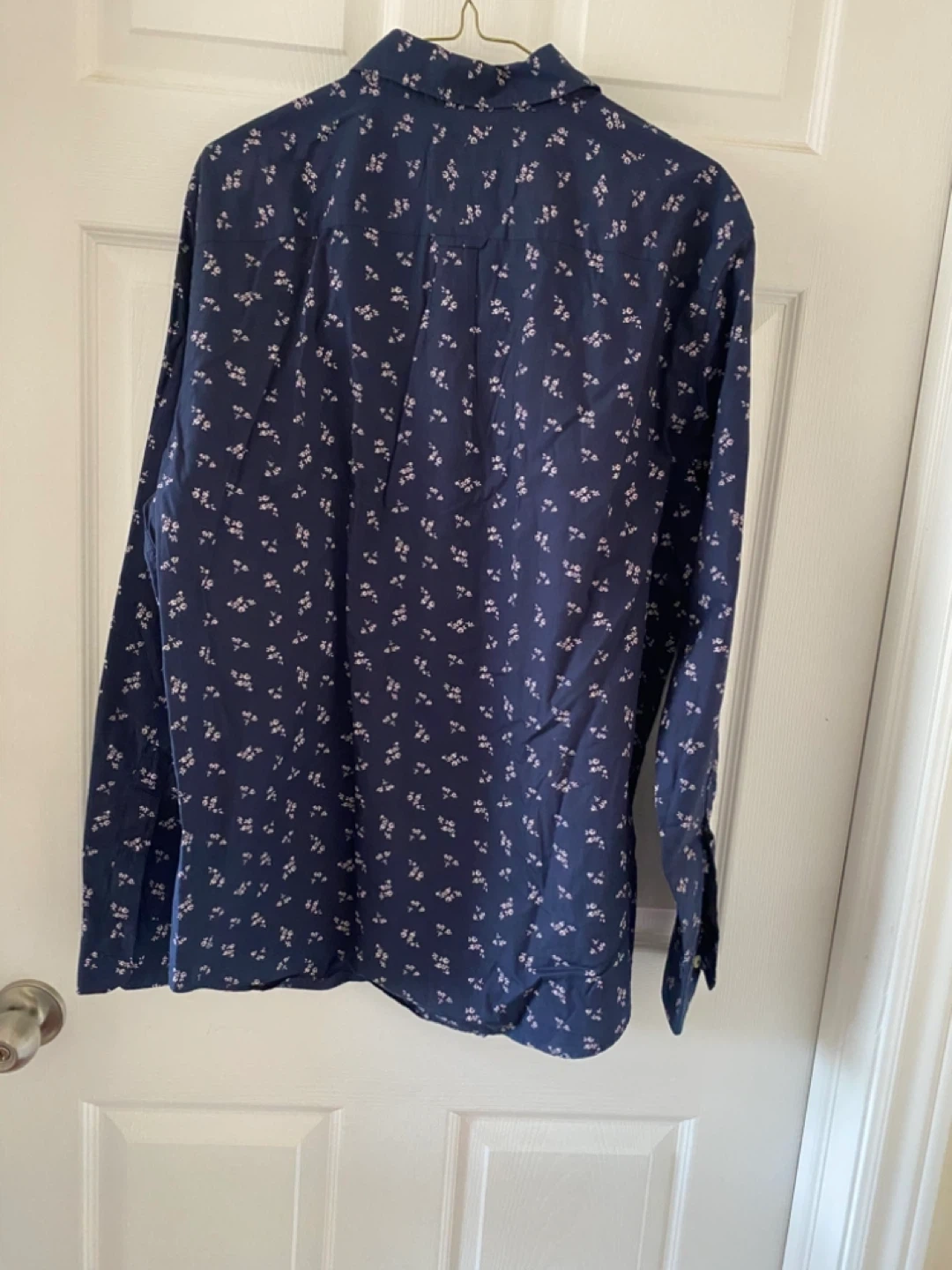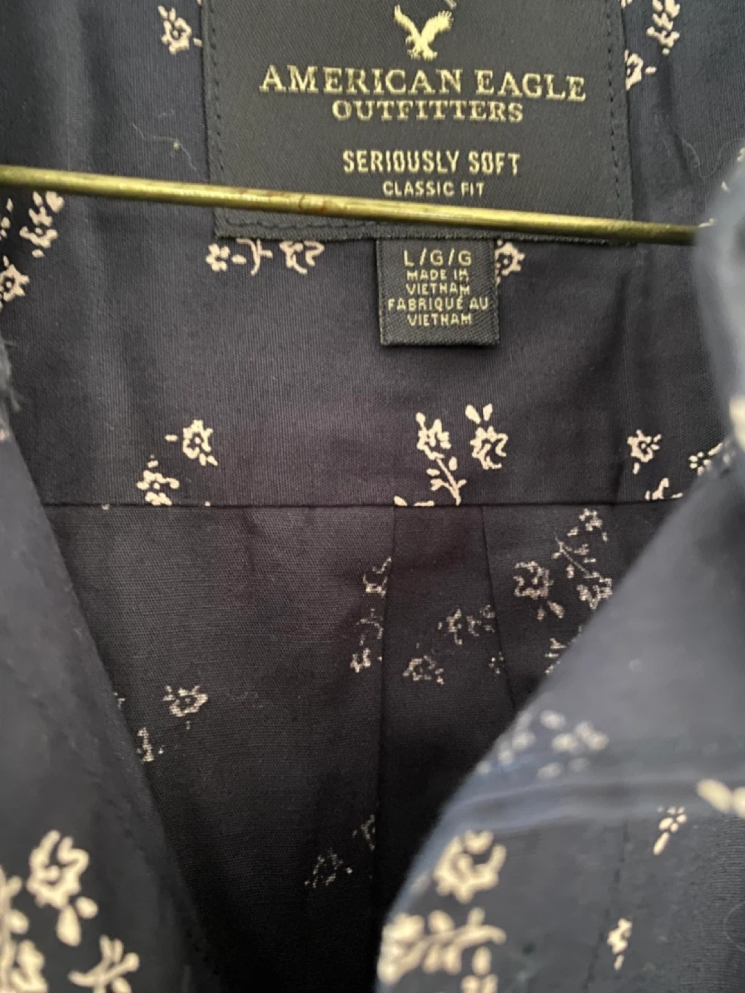 This is an American Eagle Outfitters "Seriously Soft" Classic Fit button-up shirt. It's navy with a small white floral pattern. size L.