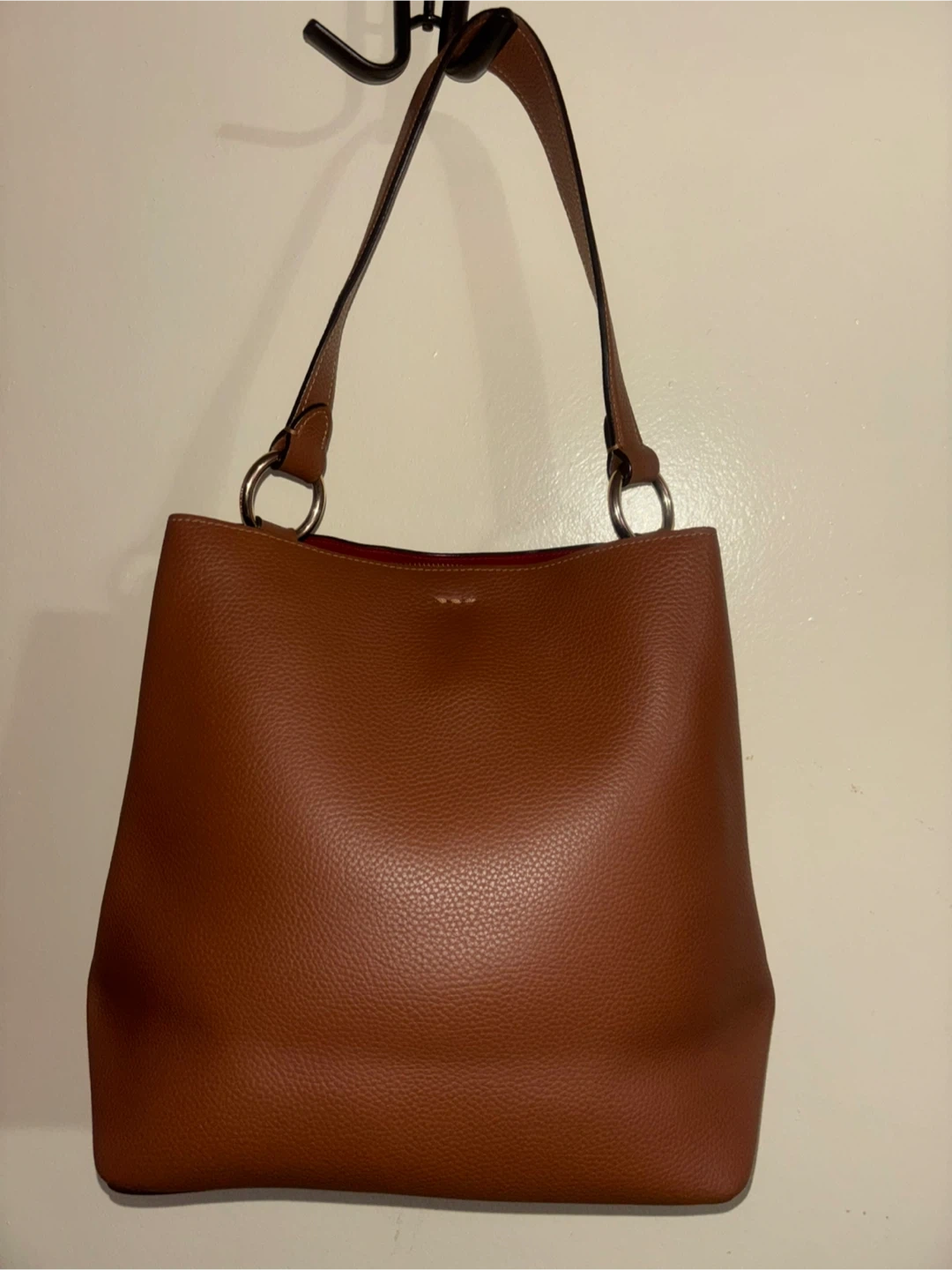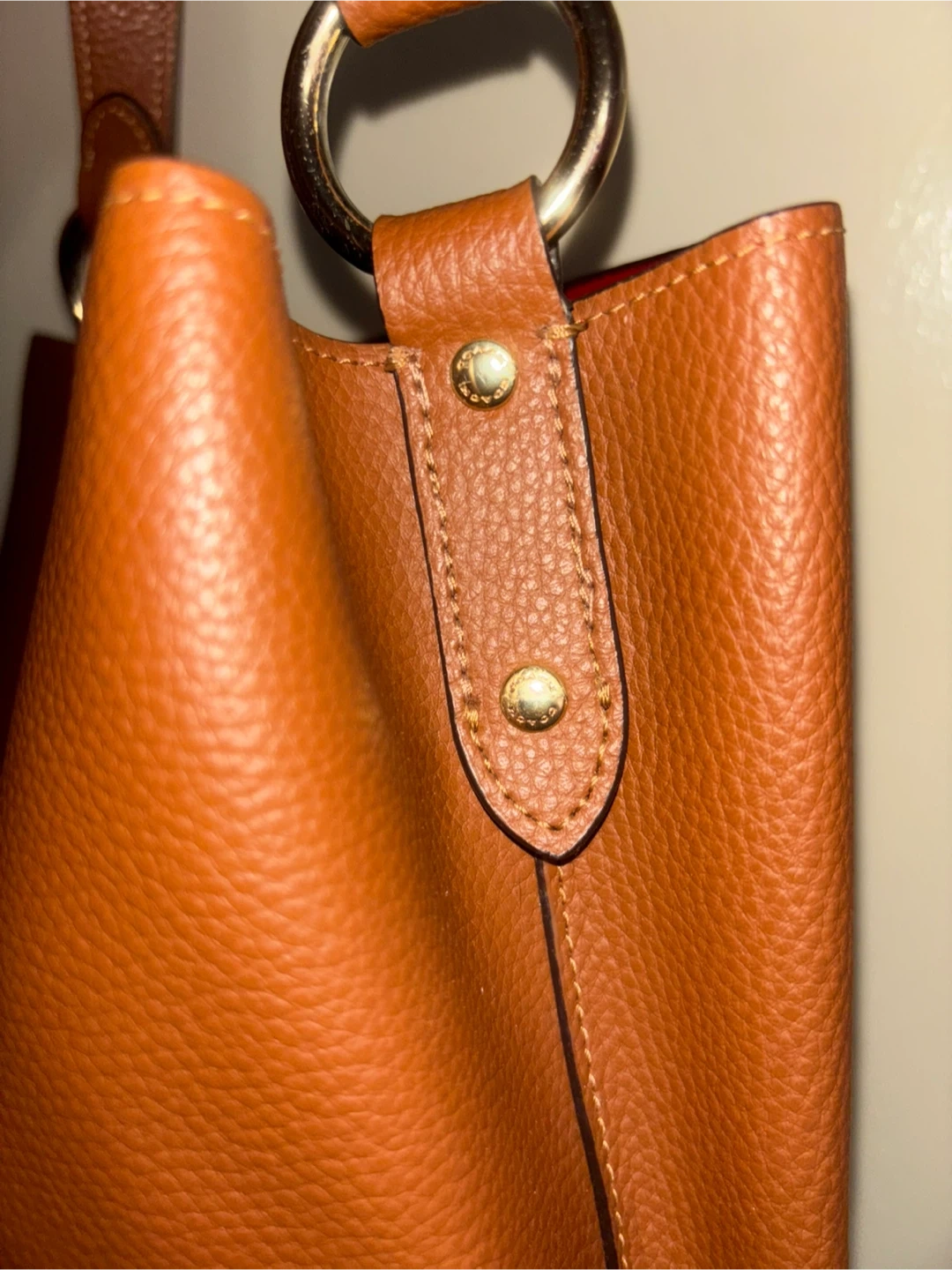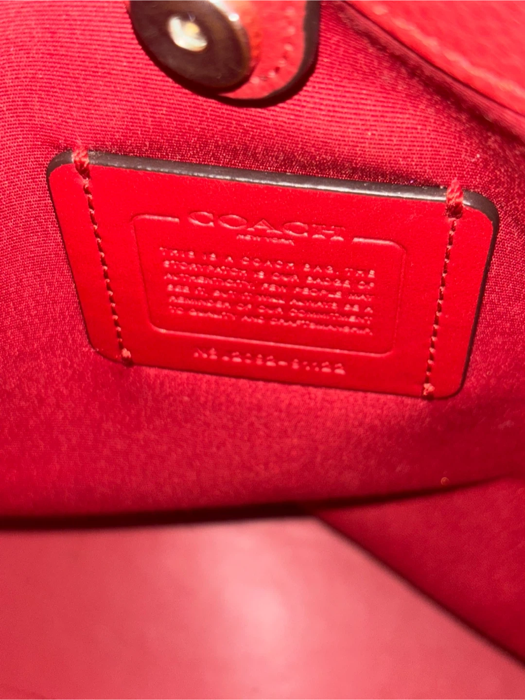 This is a Coach bucket bag made from textured leather. It features a classic saddle brown colour and a red interior lining. The bag's interior includes a Coach creed stamp and serial number.