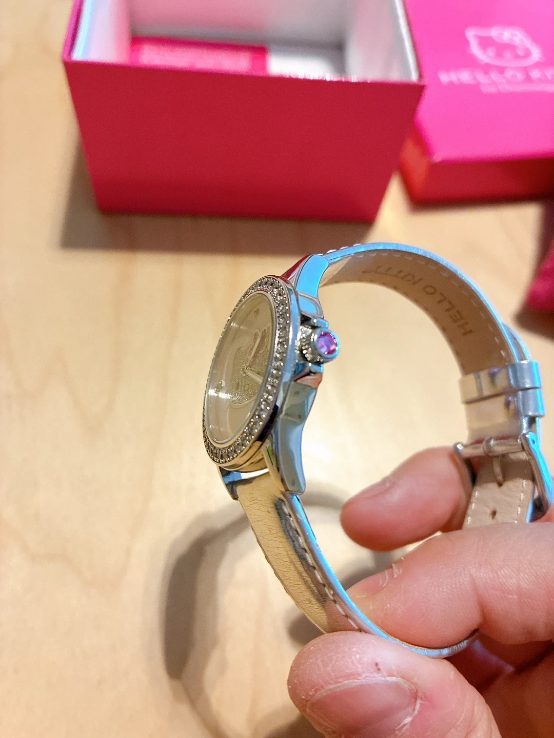 This Hello Kitty watch features a silver-tone band and a sparkly dial. It's adorned with small crystals around the bezel. Includes the original pink presentation box. A fun accessory for any Hello Kitty fan!