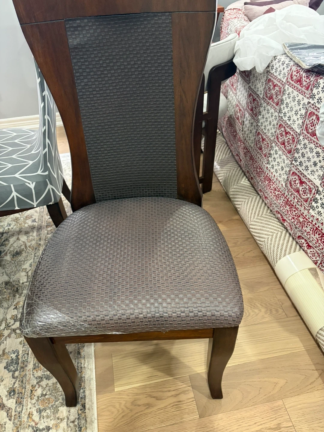 Dark Wood Dining Chair with Textured Grey Seat and Back