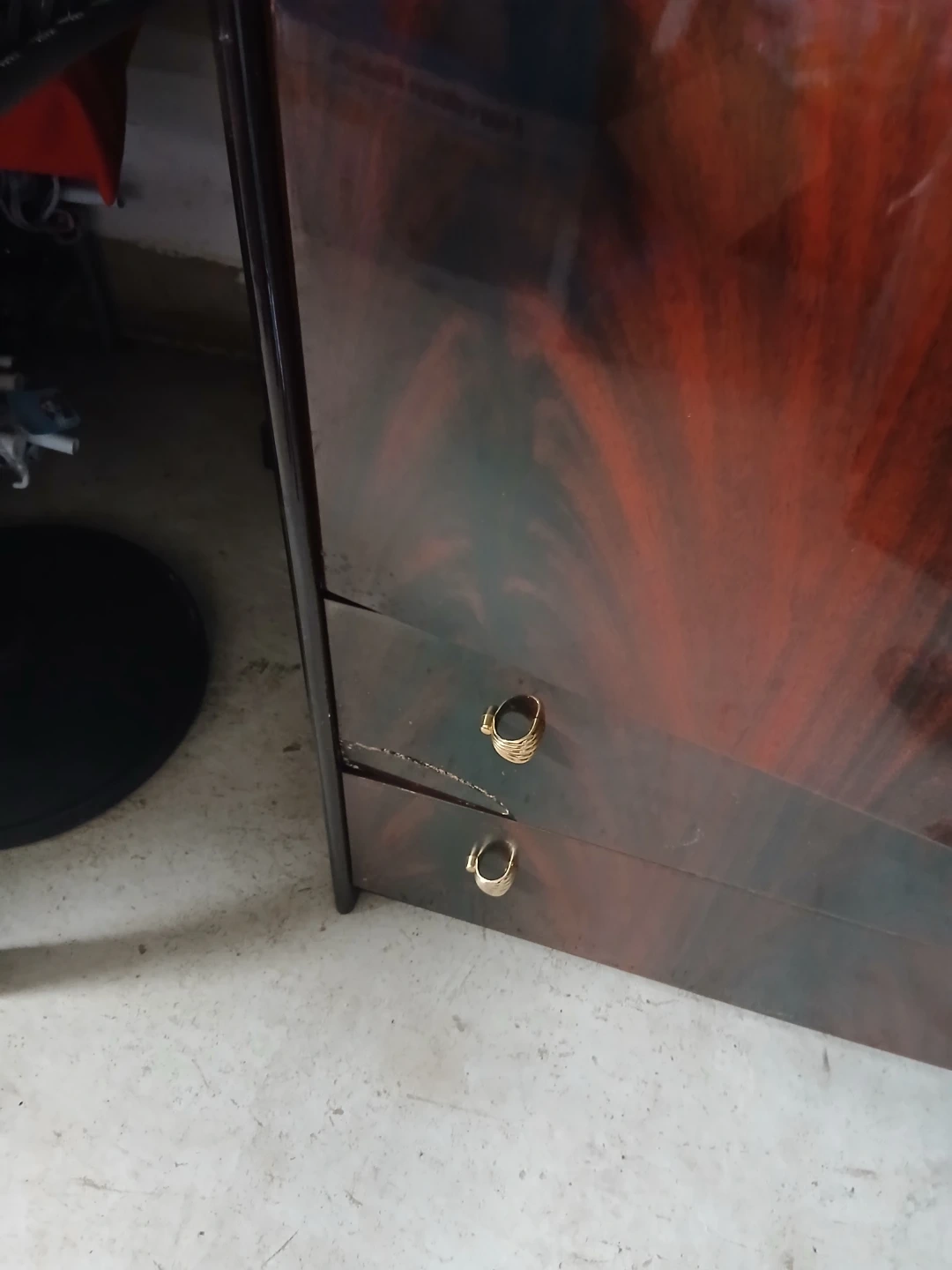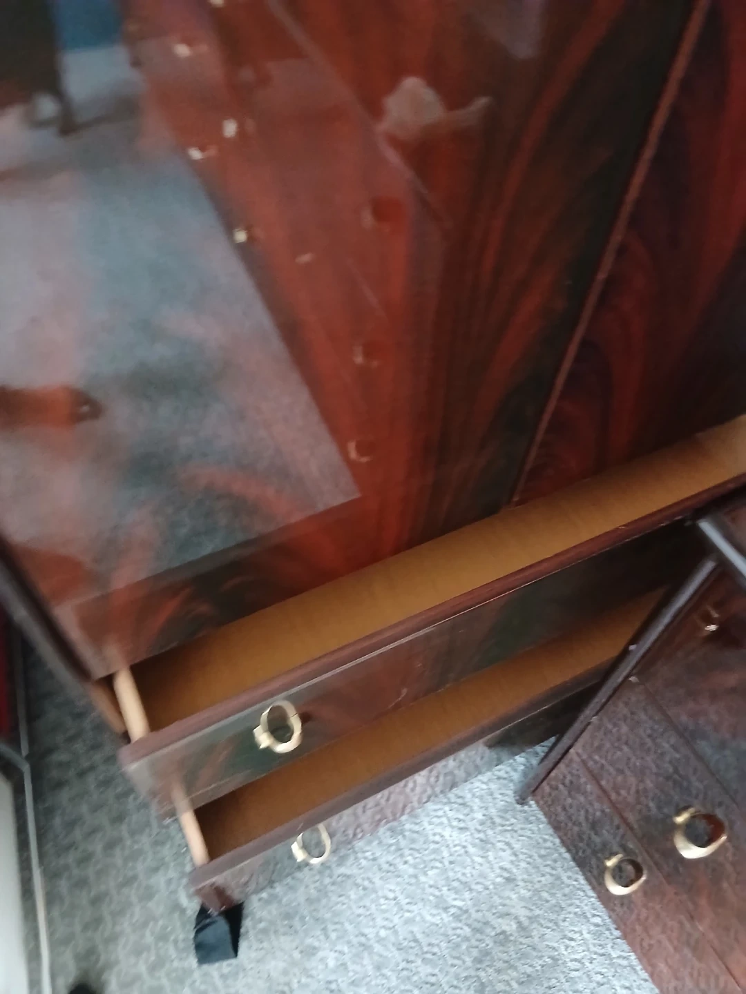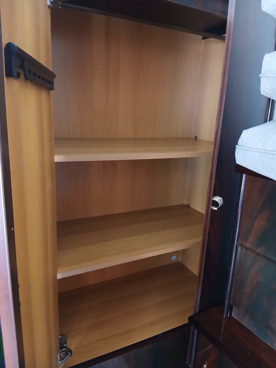 A spacious armoire wardrobe featuring a rich, dark wood veneer with a high-gloss finish. It includes a hanging rod and three shelves inside, along with two drawers at the bottom. This piece would be useful for storing clothes or linens.