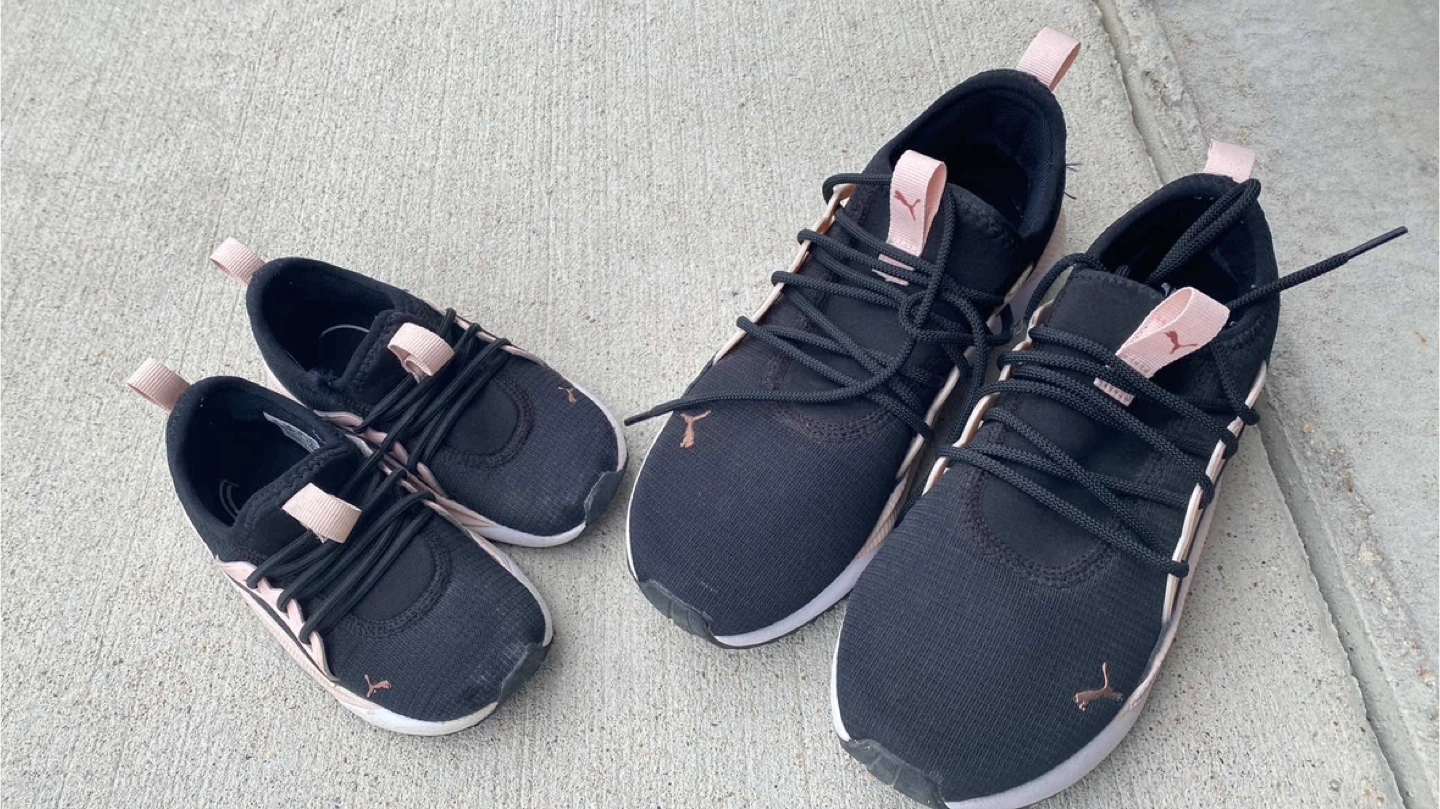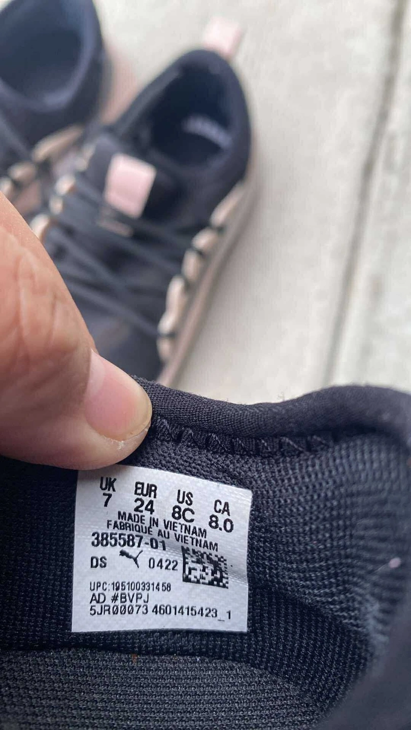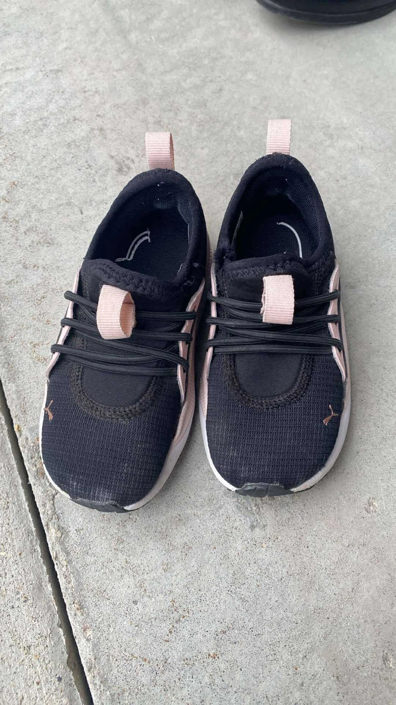 Used in good condition. 2 pairs of Puma sneakers. Black fabric upper, rose gold accents. One pair size 6.5Y (fits women size 8), other pair size 8C.