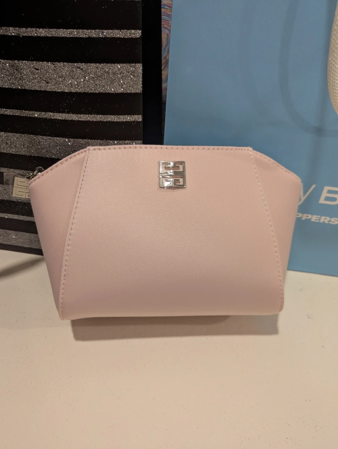 This is a pale pink Givenchy cosmetic pouch. It's made from a smooth material with a silver-tone logo emblem. Perfect for organizing makeup or small essentials.