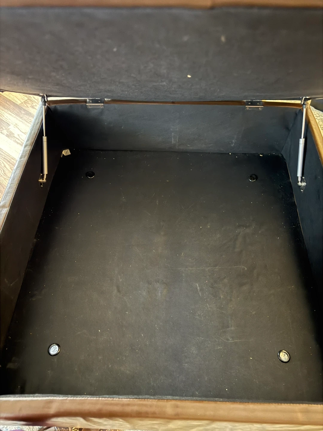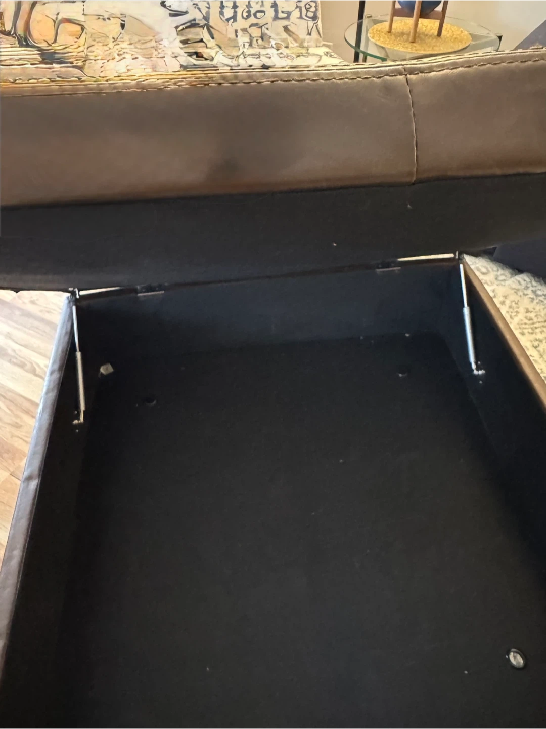 Chocolate brown leather ottoman with storage.