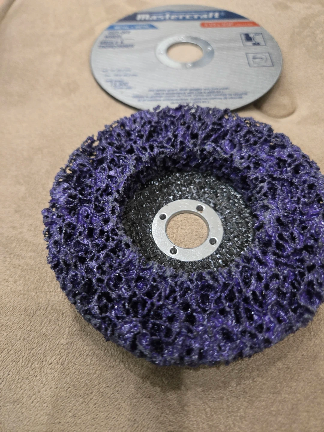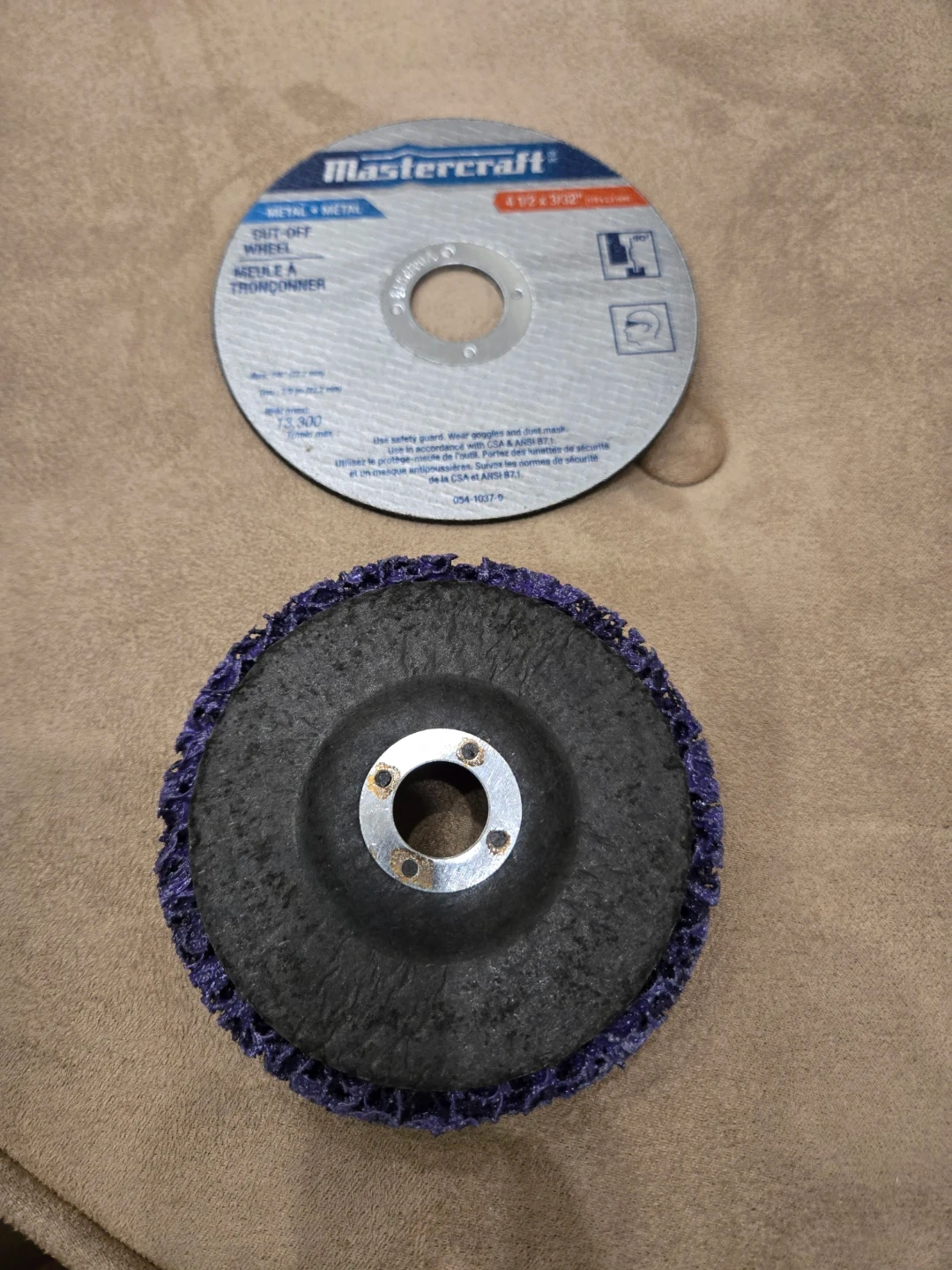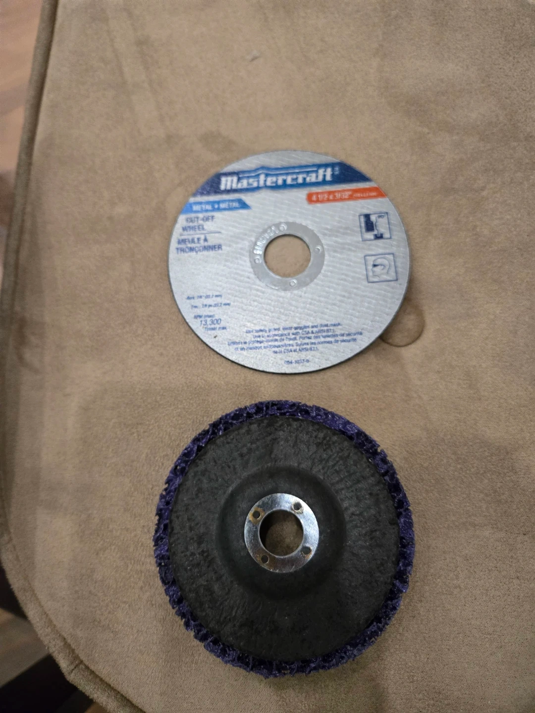 This is a Mastercraft cut-off wheel for metal and a purple flap disc. The cut-off wheel is 4 1/2 x 3/32 inches. It's rated for 13,300 RPM max. The flap disc is also for metal applications.4" . Great for grinding and smoothing metal surfaces!
