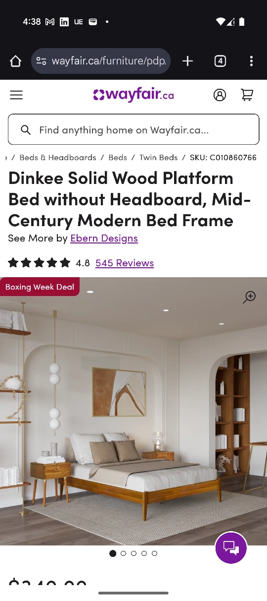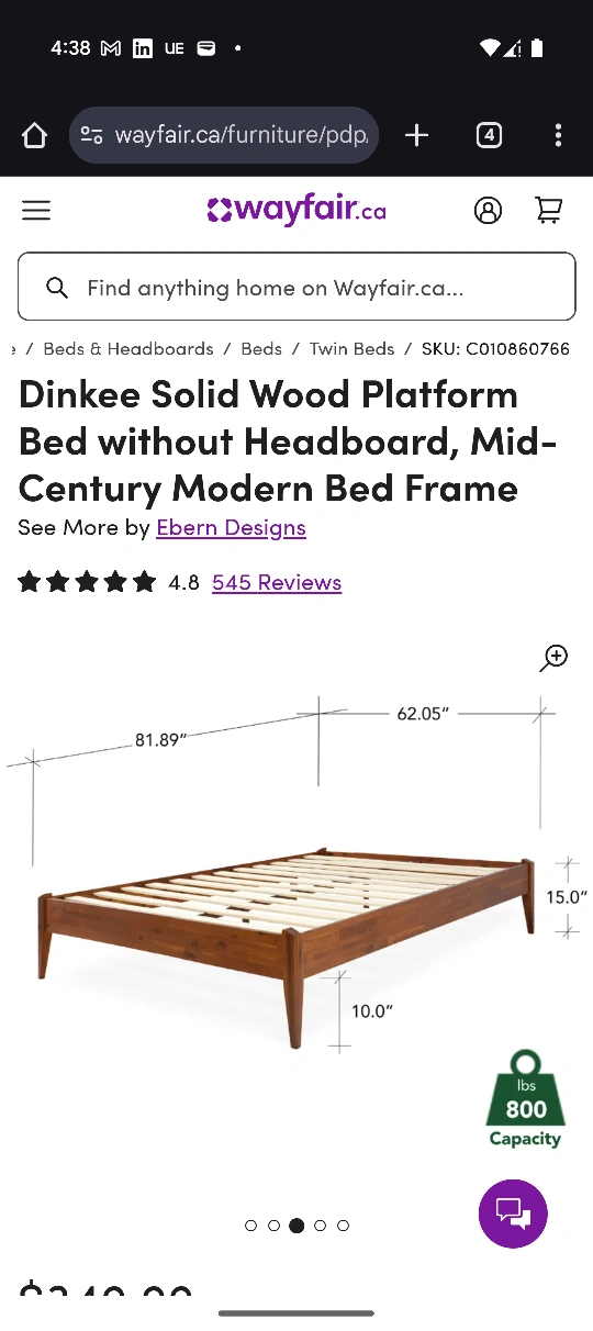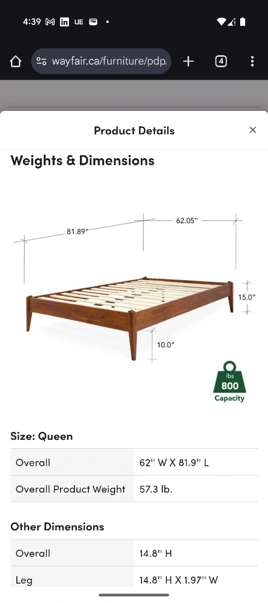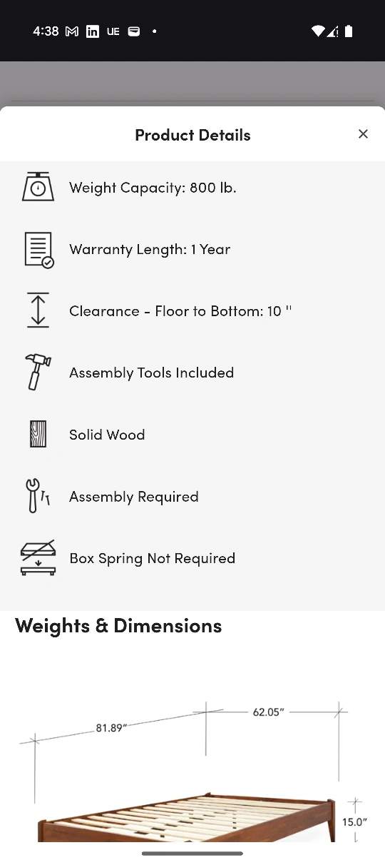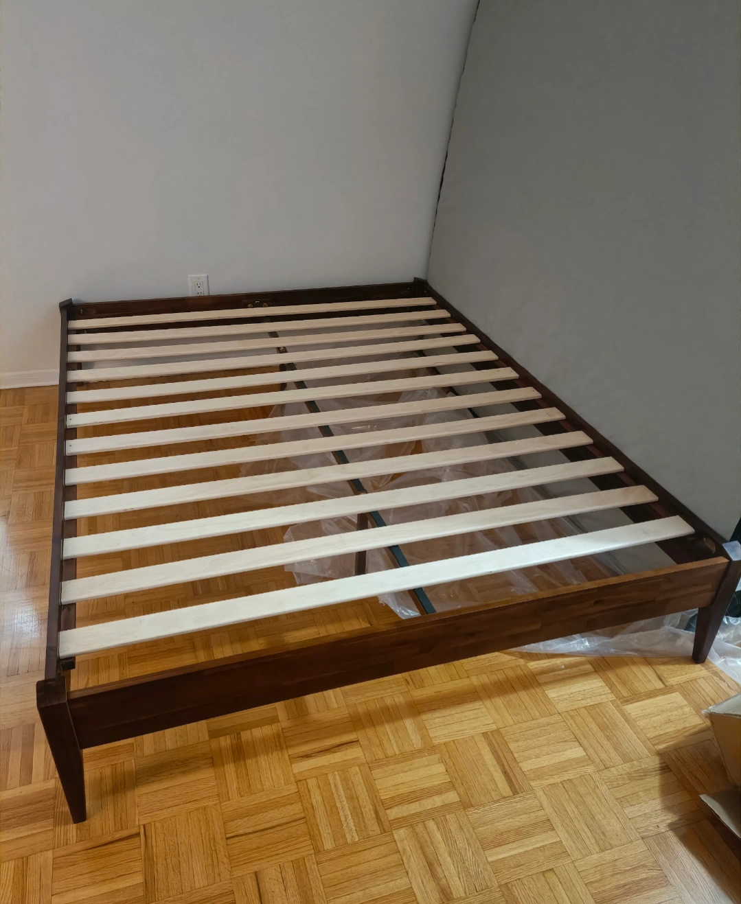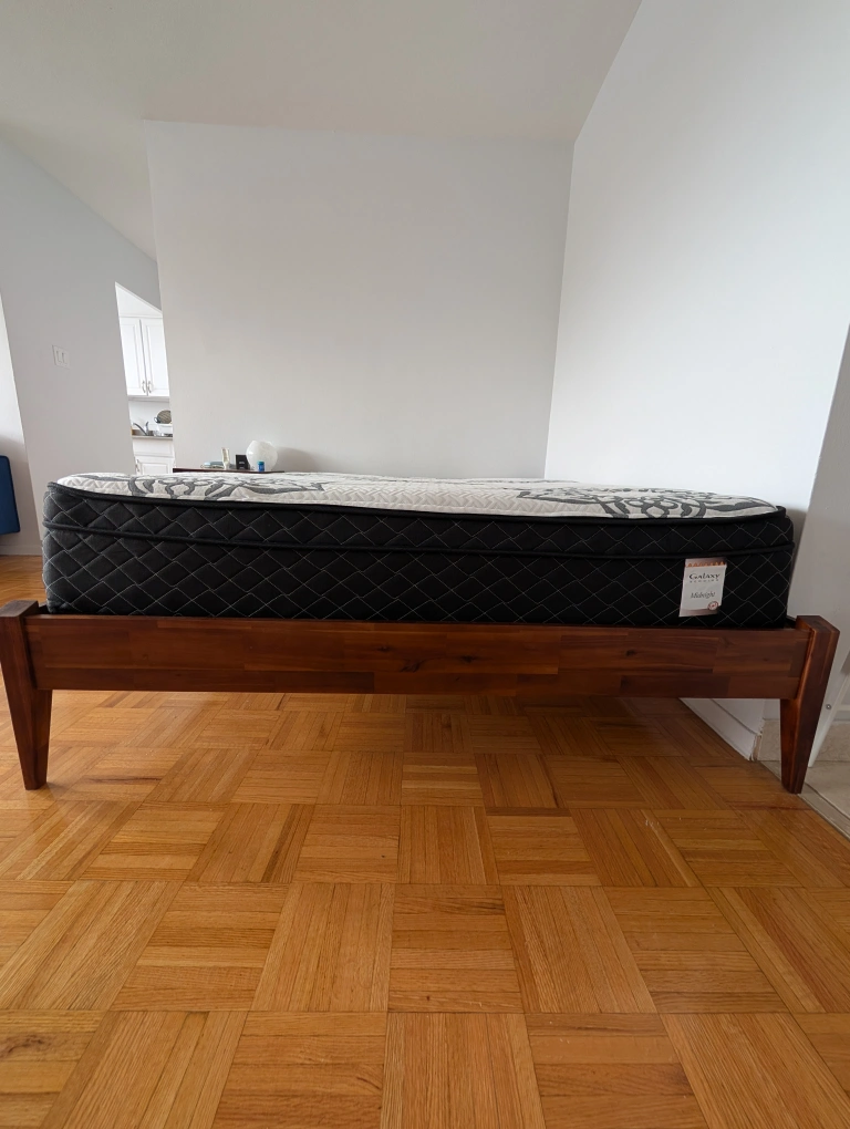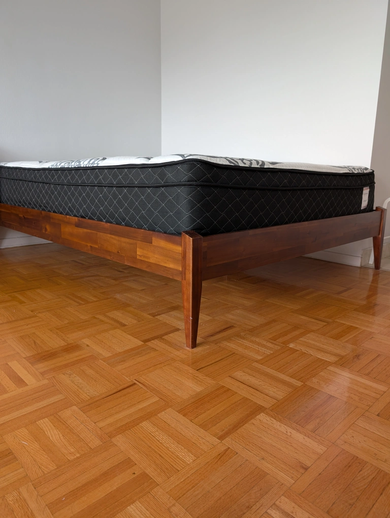 Solid wood bed frame, no headboard. Mid-century style. Assembly required. Box spring not required.