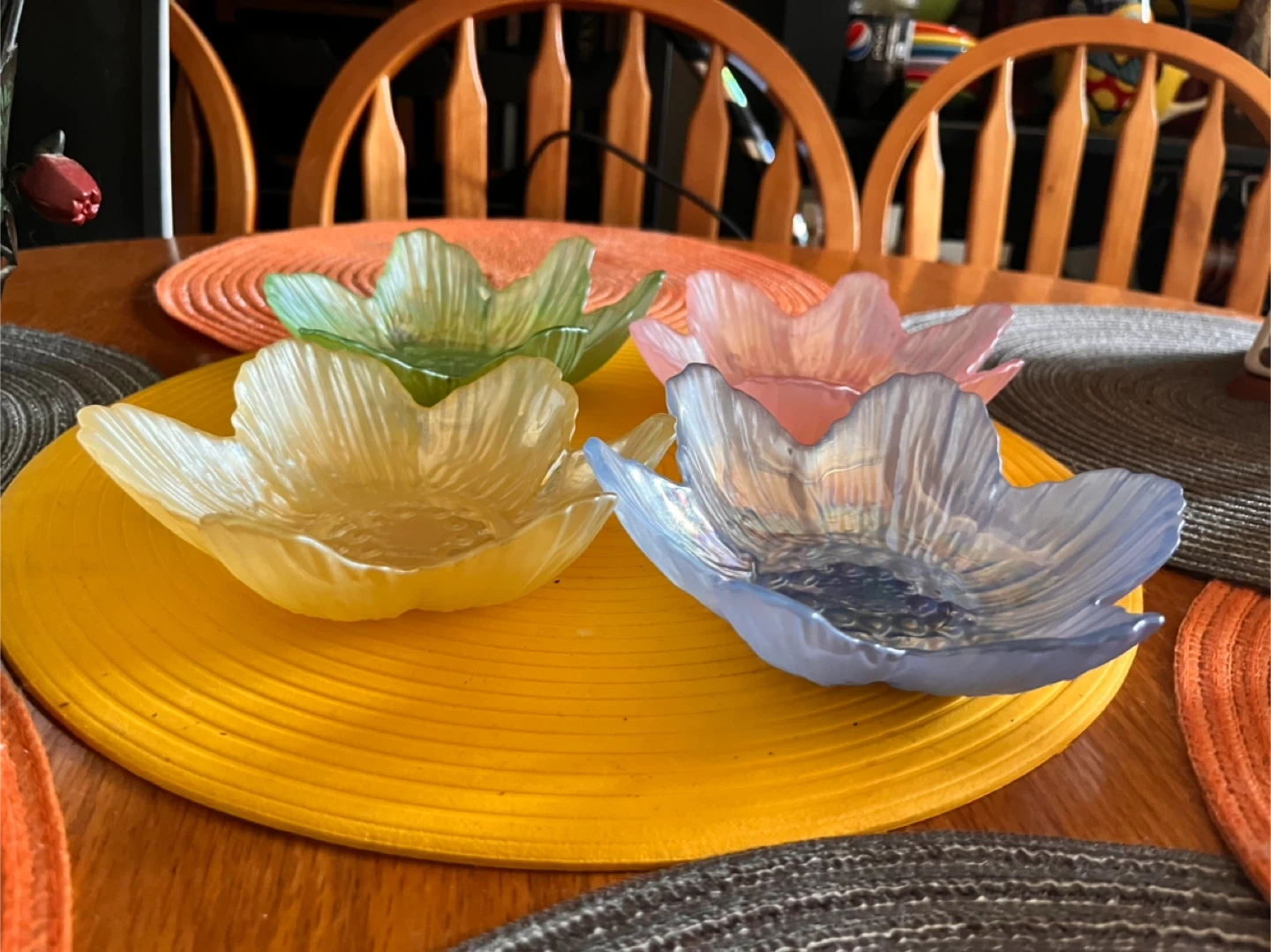 This is a set of four decorative glass bowls. They are shaped like flowers and come in pastel shades of green, pink, yellow, and blue. They're perfect for serving small snacks or dips!