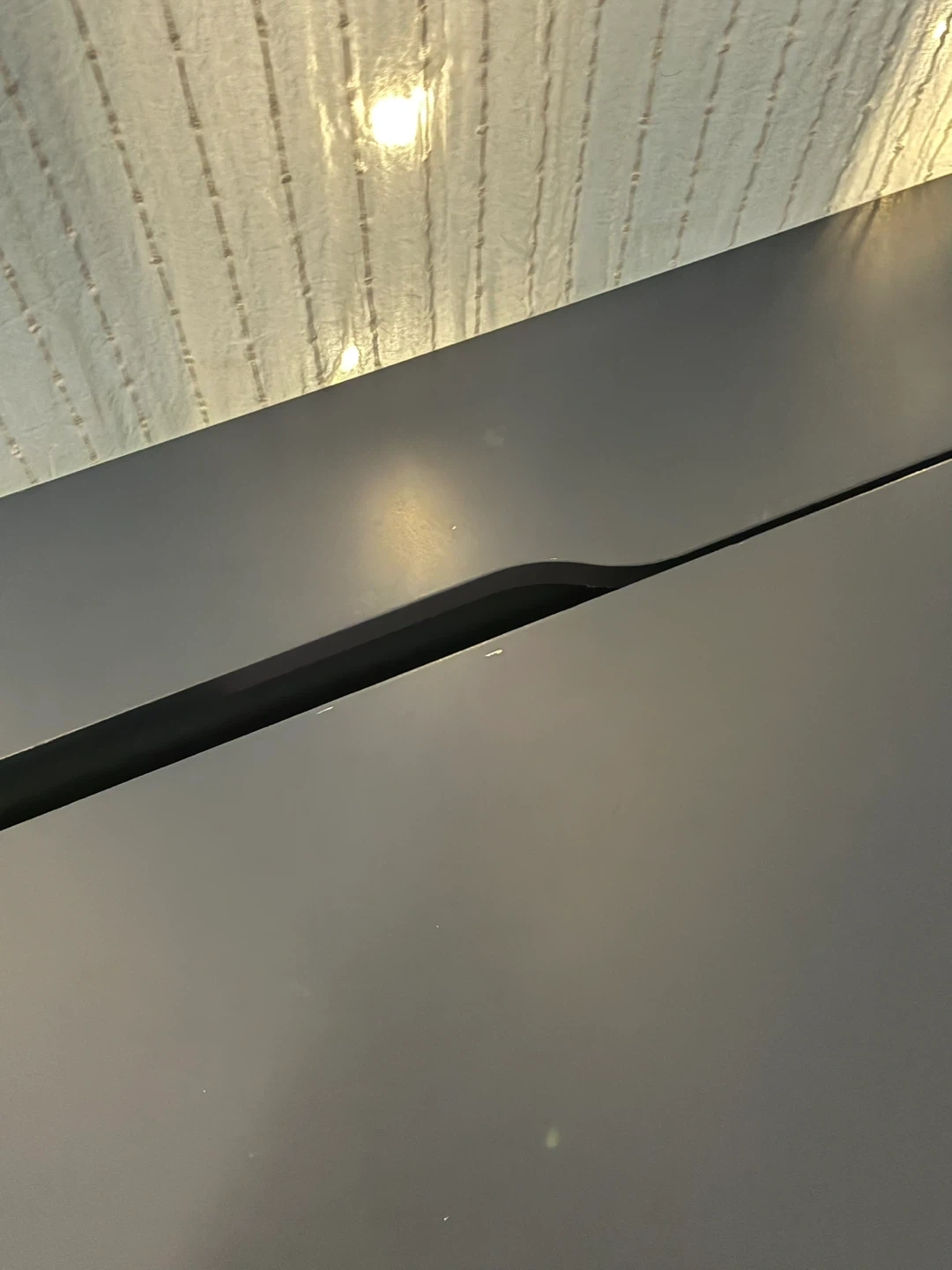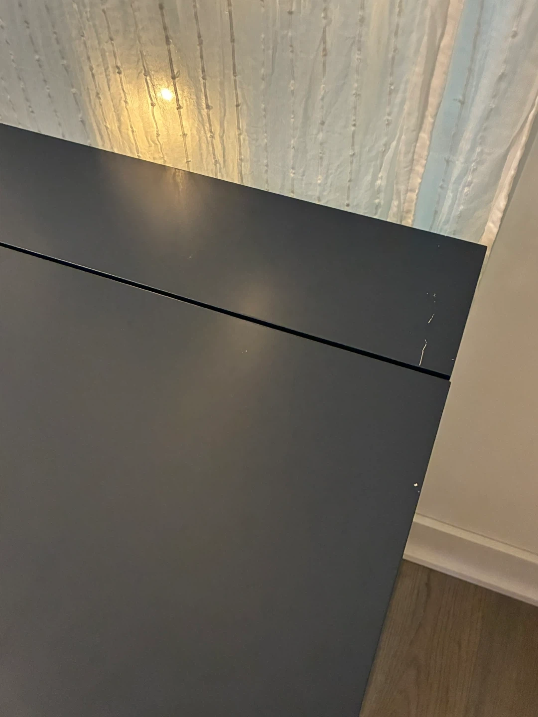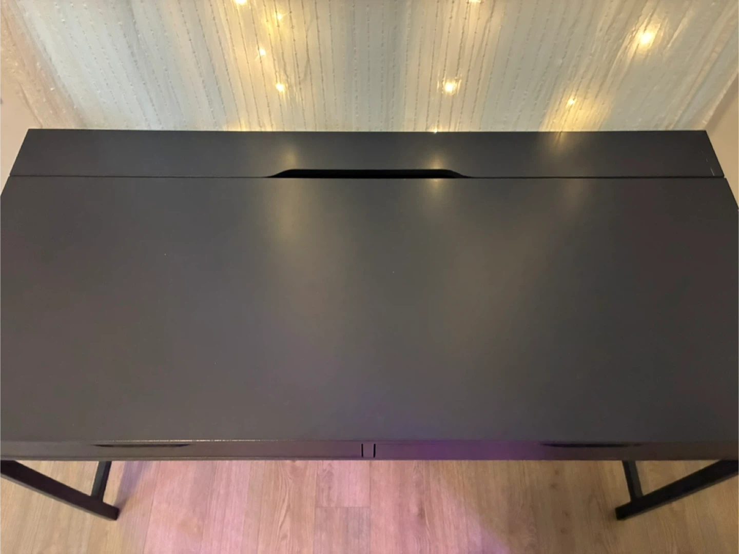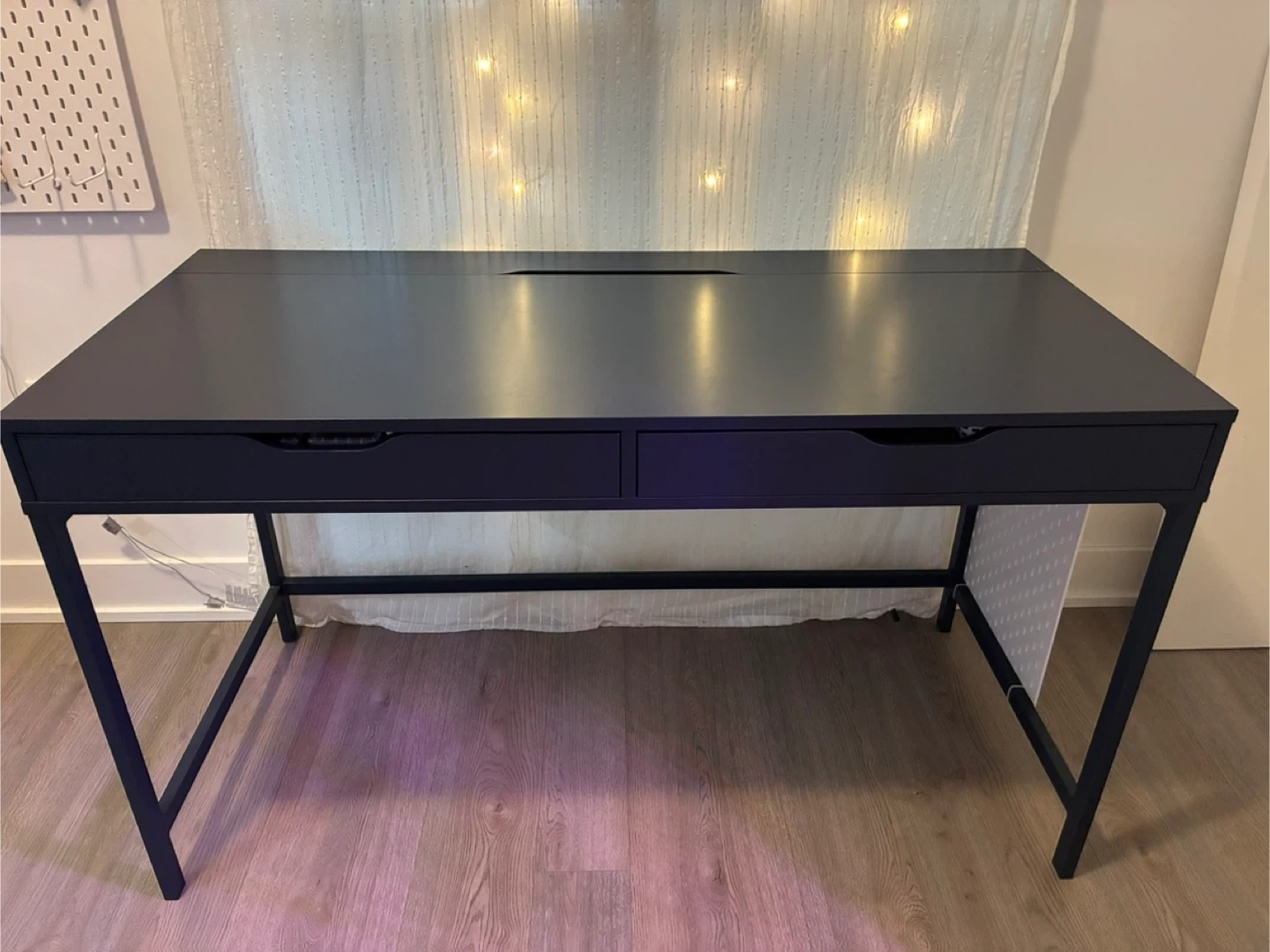 Selling Ikea limited navy (black-blue) desk. It has a cutout under the desk for monitor arm (not visible when built in cable management lid is closed) and some scratches from usage as shown in the photos.
