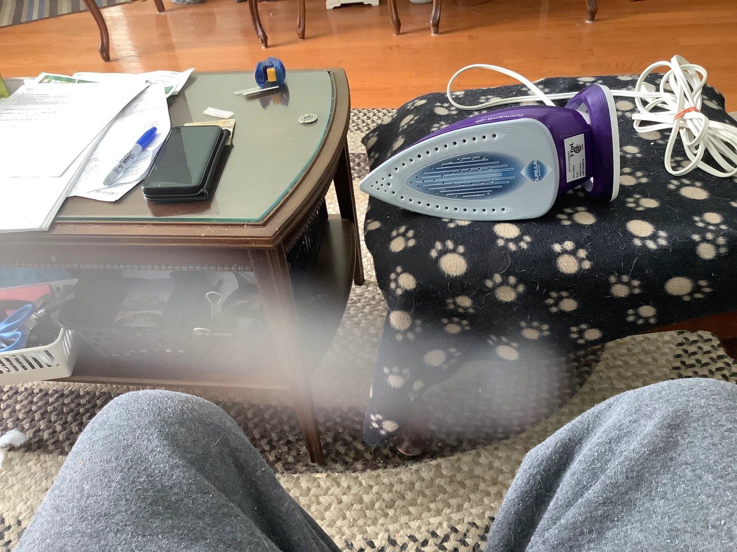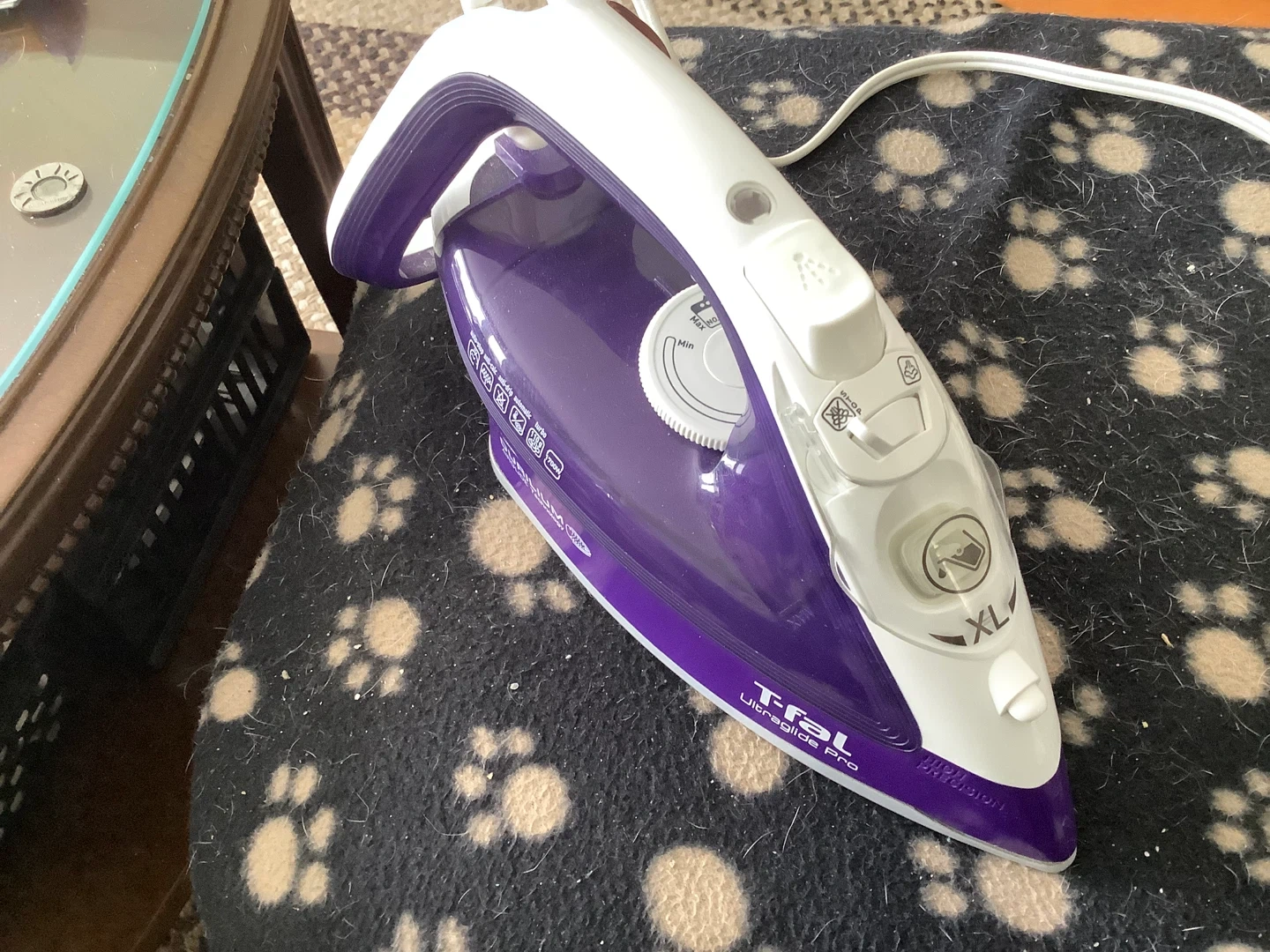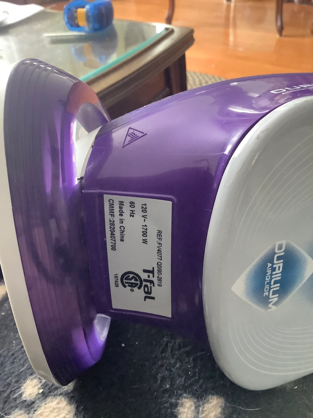 This T-fal Ultraglide Pro steam iron features a Durilium Airglide soleplate. It's designed for easy glide and efficient ironing. This iron is 1700 W and operates at 120 V. It's purple and white.