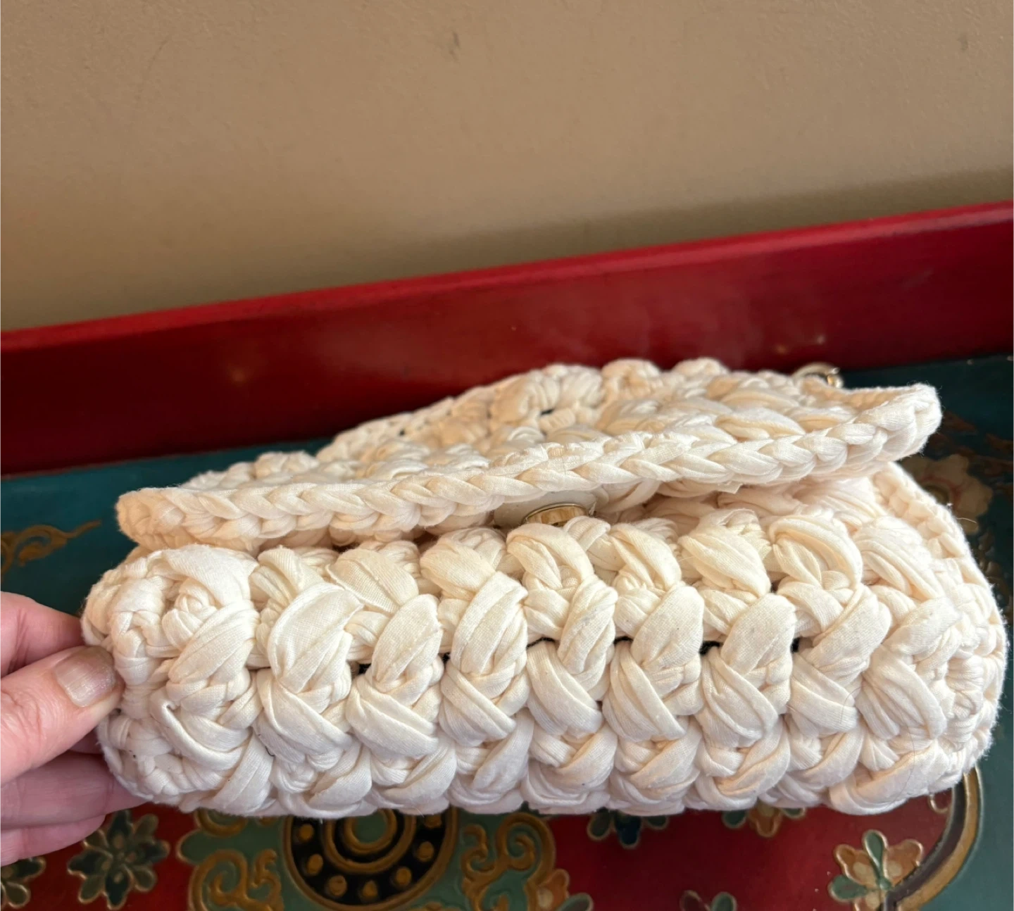 Zara white shoulder bag with a crocheted texture and gold chain detail. It features a flap closure with a snap button. This bag is a great accessory for casual outings! Really original and unique design! Great condition, includes an adjustable strap. Pick up in Chestermere.
