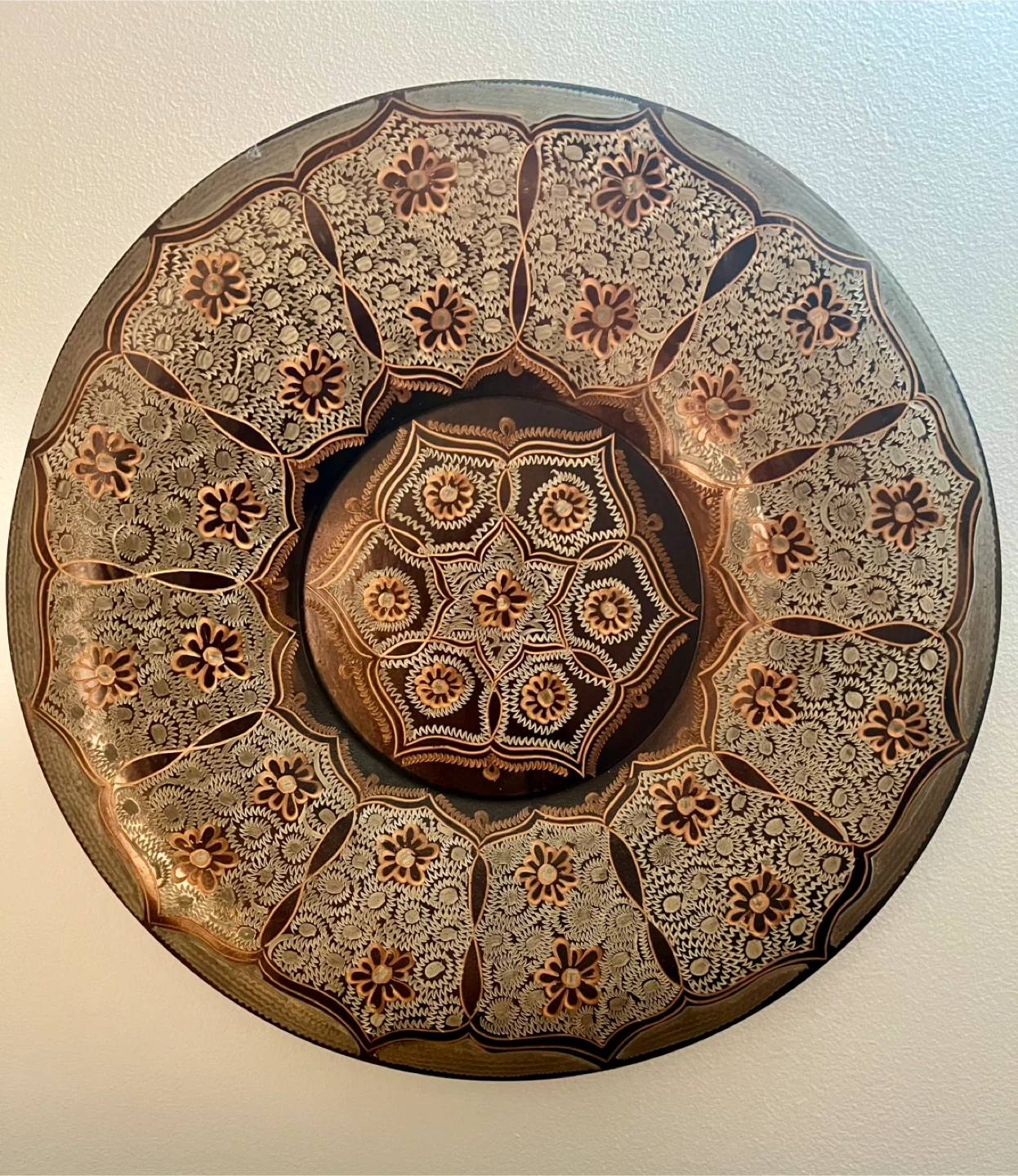 This is a decorative wall plate with a floral pattern. It features a dark brown background with intricate floral designs in beige and copper tones. It would make a lovely addition to any room!