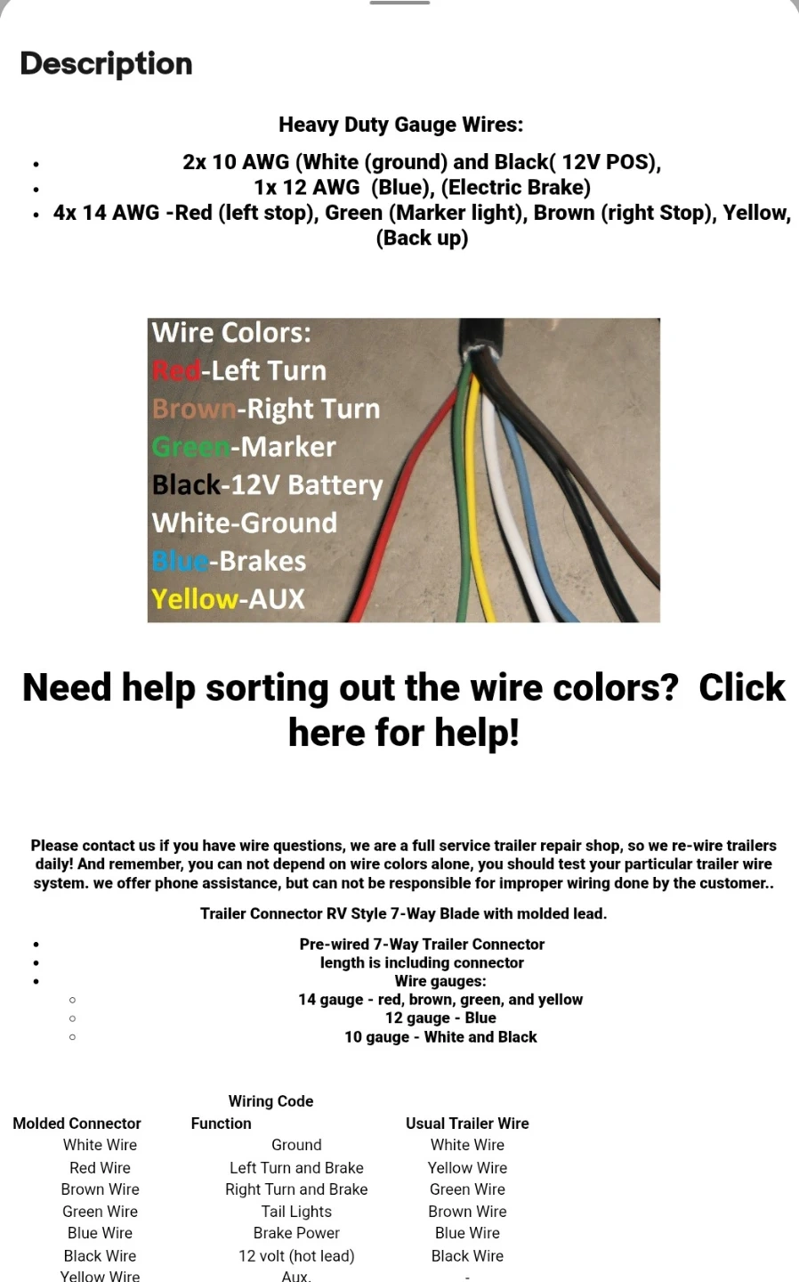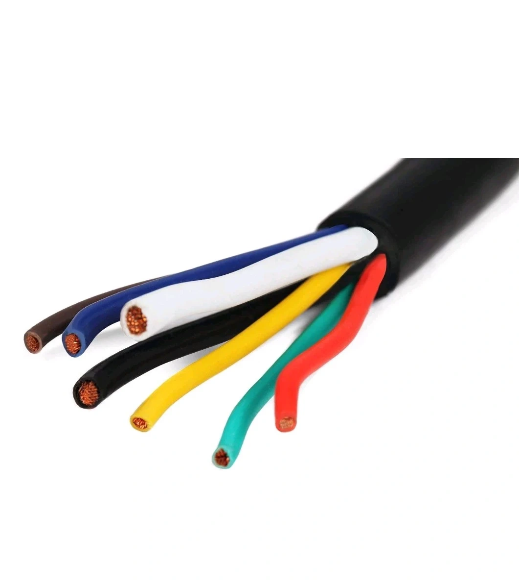 Heavy duty trailer wiring cable with a 7-way RV plug. Includes 2x 10 AWG and 4x 14 AWG wires. Wire colours are red, brown, green, black, white, blue, and yellow. Pre-wired 7-way trailer connector.