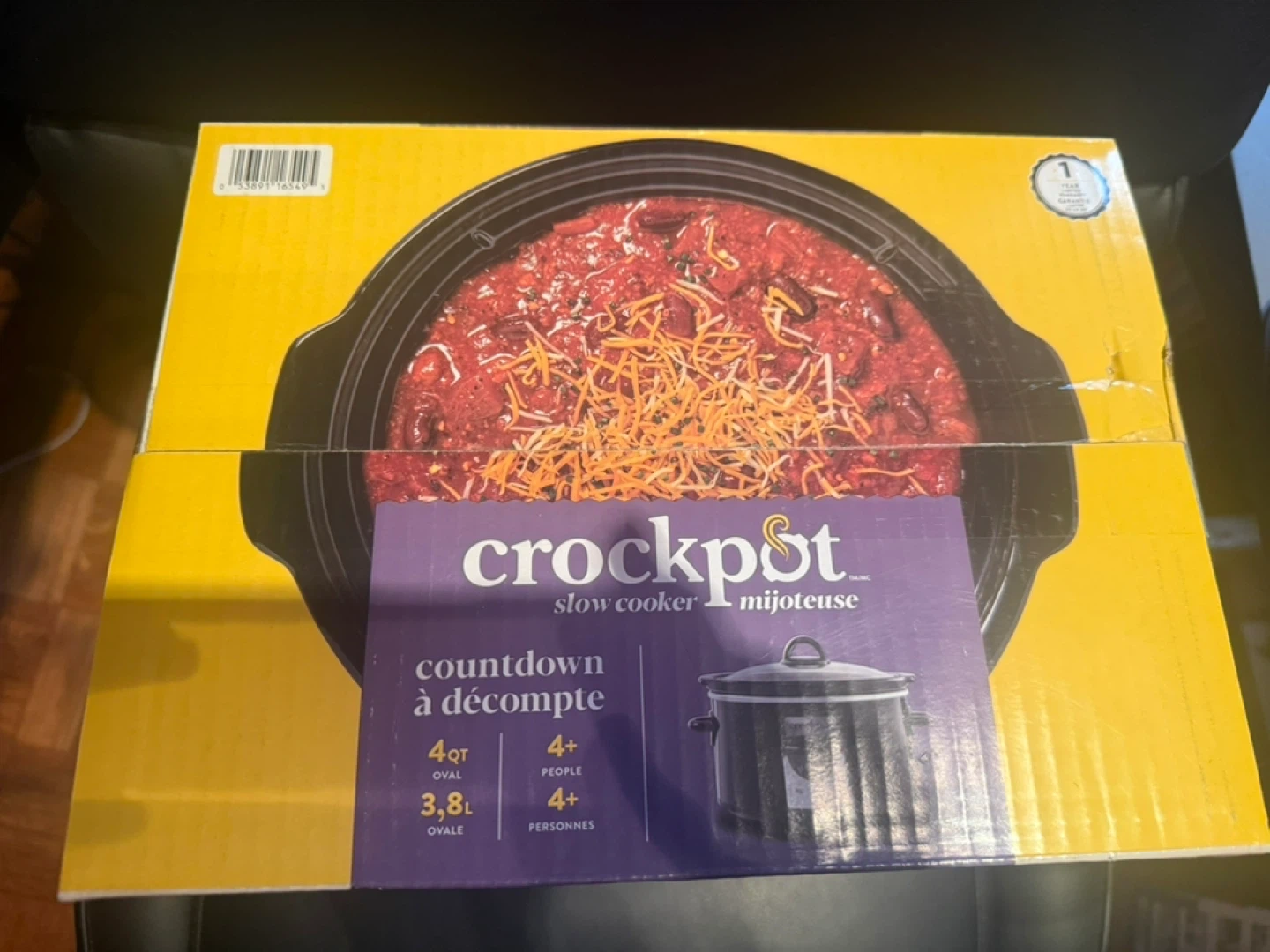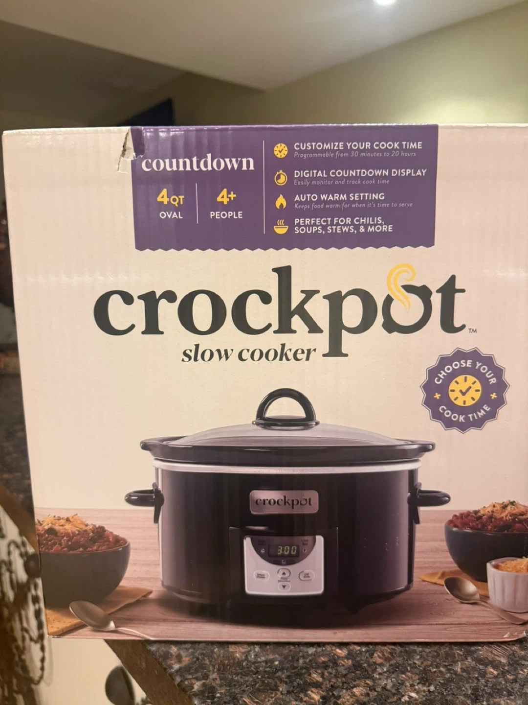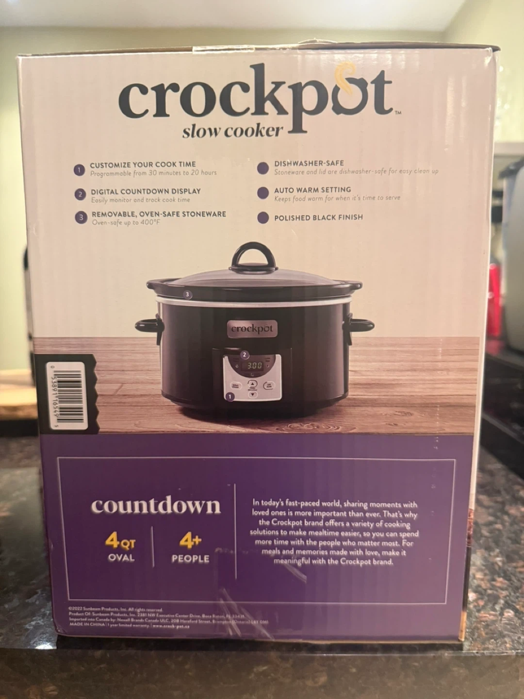 This Crock-Pot mijoteuse is oval-shaped with a 3.8L capacity, serving 4+ people. It features digital countdown programming and a stoneware pot that's oven safe up to 200°C. Perfect for preparing chilis, soups, and roasts!