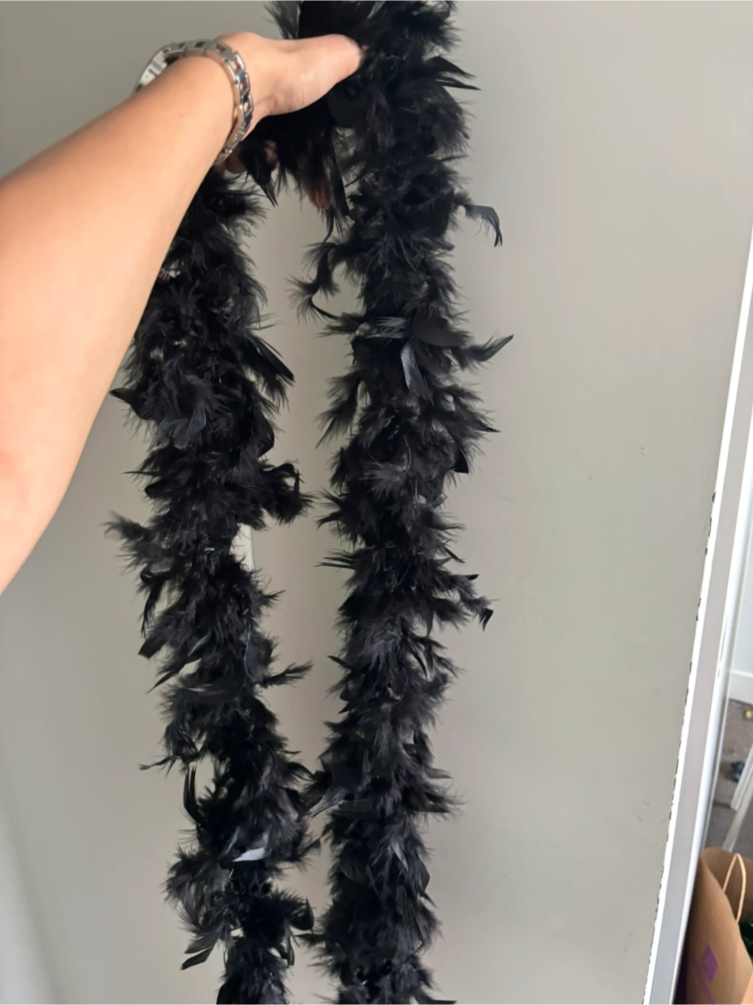 A fluffy black feather boa. It has a soft feel. This boa is perfect for costumes or parties! Used once for a retro party. I’m selling it so that someone can use it, it has been sitting in my storage.