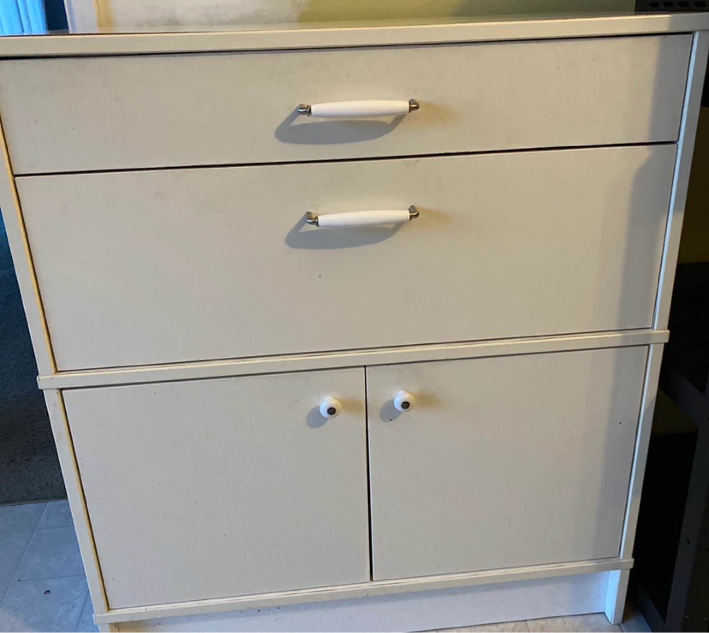 This is a cream-coloured storage unit with two drawers on top and a cabinet with two doors below. It features simple white handles and knobs. It's a compact piece perfect for organizing smaller spaces. Size 17x33x37