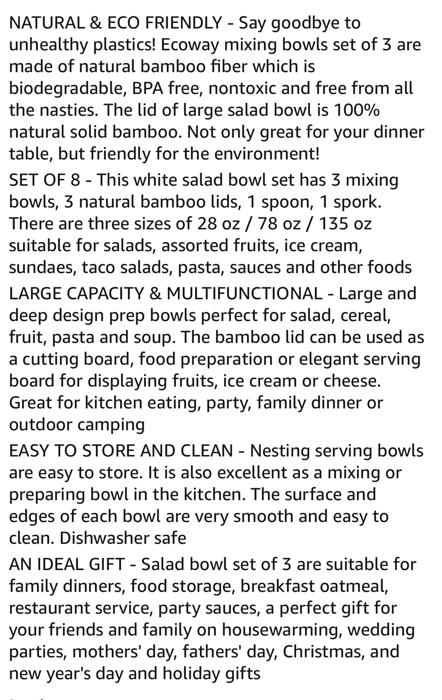 Set of 3 mixing bowls made from bamboo fiber with bamboo lids. Includes serving utensils. The largest bowl has a diameter of 9.80 inches. These bowls are great for serving salads or storing food. Brand new but no box. Pick up near the border of Brampton and Caledon. Mayfield and Kennedy