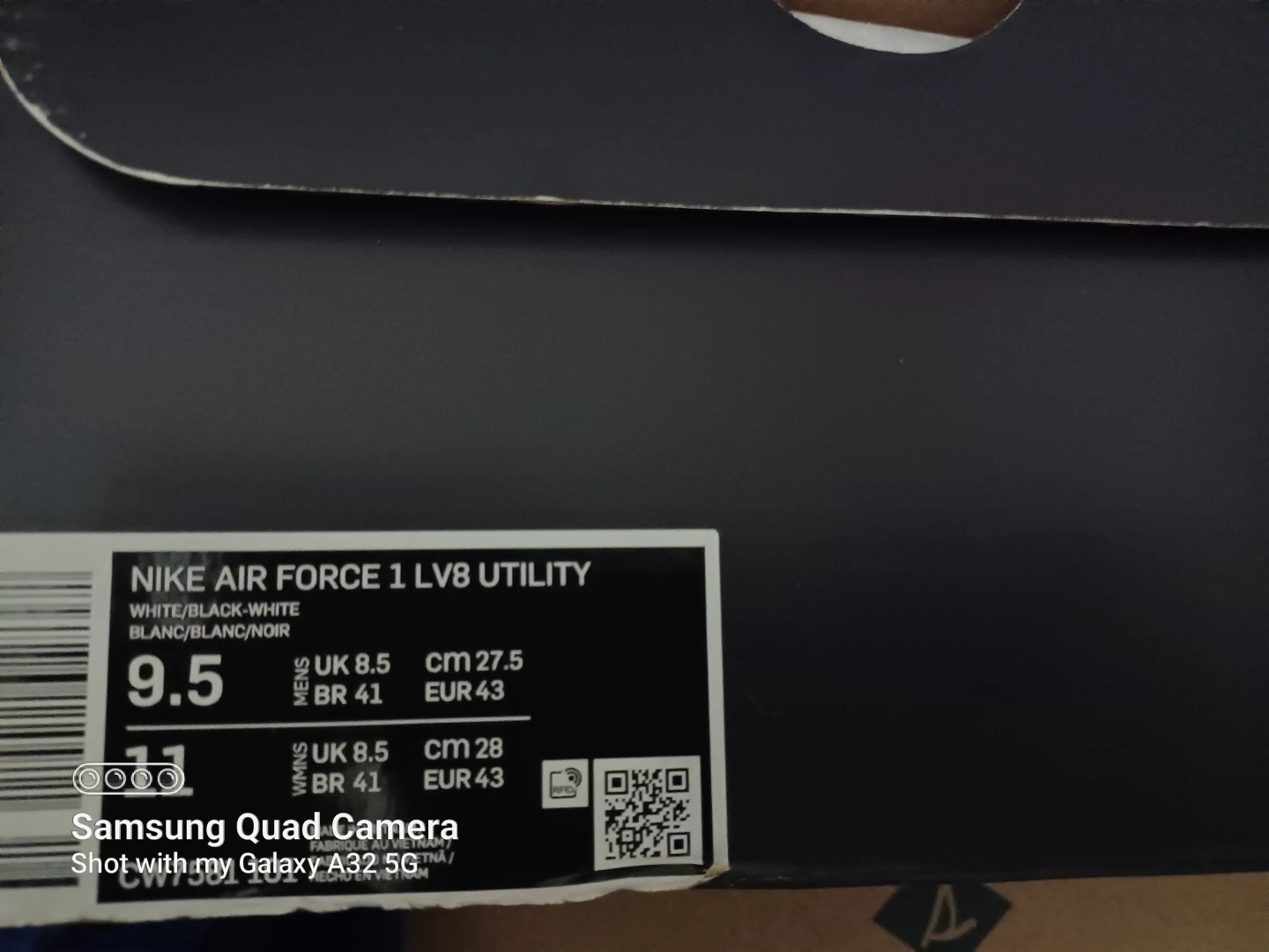 These are Nike Air Force 1 LV8 Utility sneakers in white, black, and white. They're men's size 9.5 US (UK 8.5, EUR 43). The shoes were made in Vietnam.