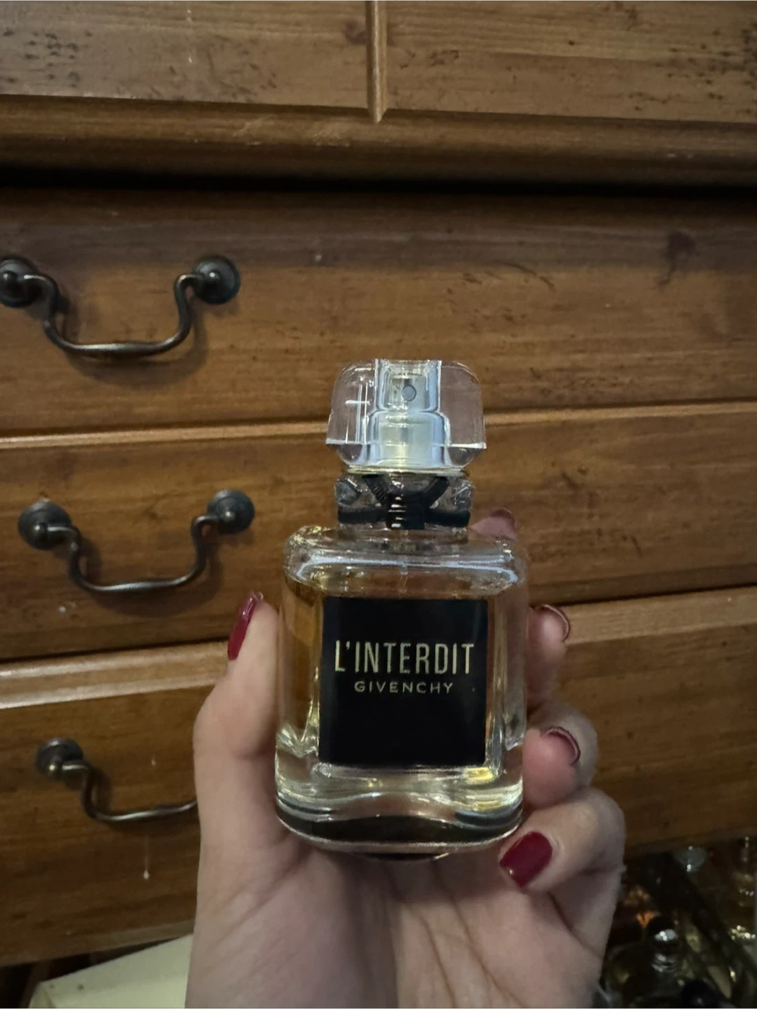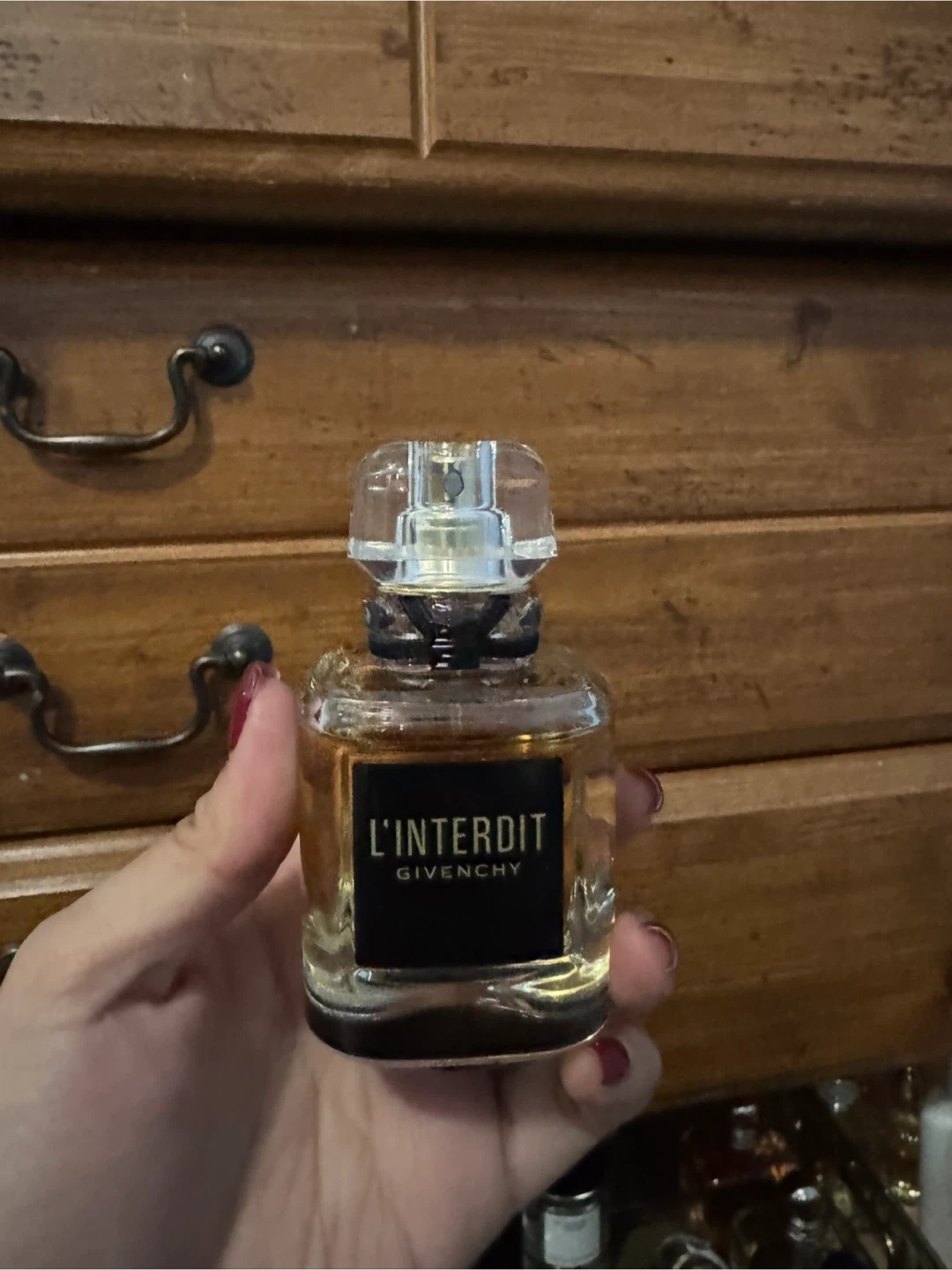 This is a bottle of Givenchy L'Interdit Eau de Parfum. This is the new released 2025. It's a classic fragrance with a floral and woody scent. This is 50 ml bottle but used around 5 ml.