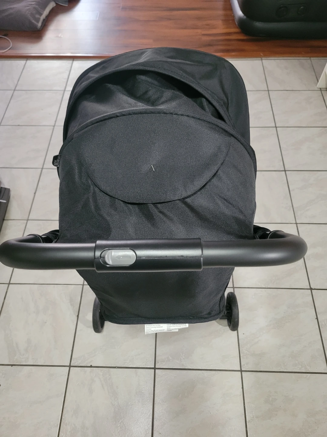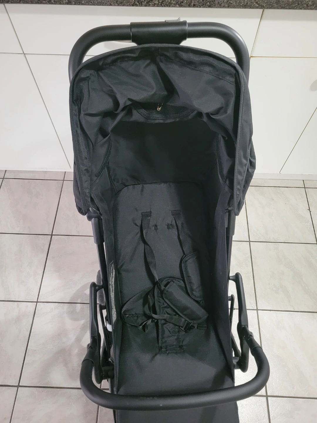 This black stroller is lightweight and easy to fold for travel. It features a secure harness and a storage basket underneath. This stroller is great for on-the-go parents!