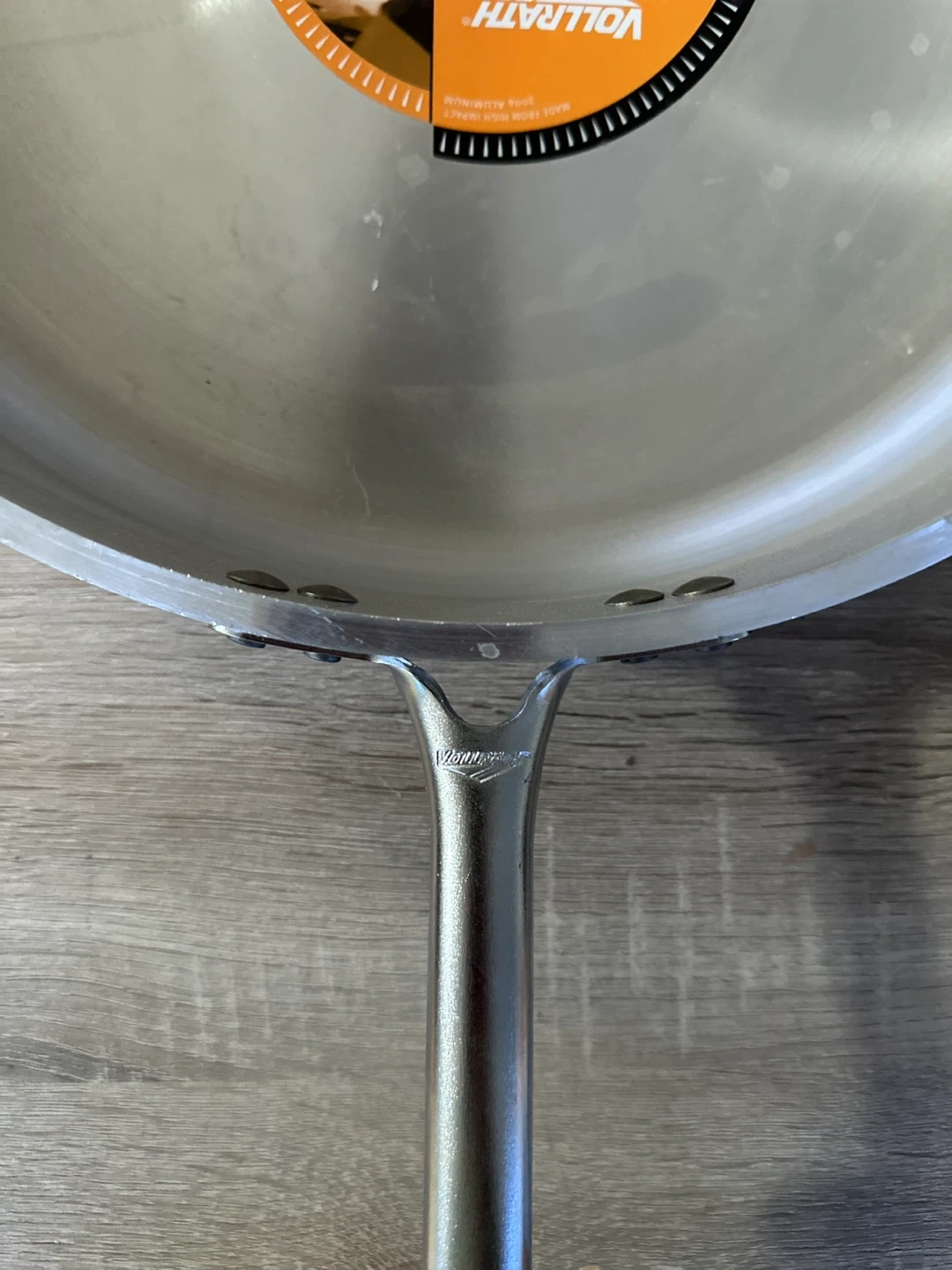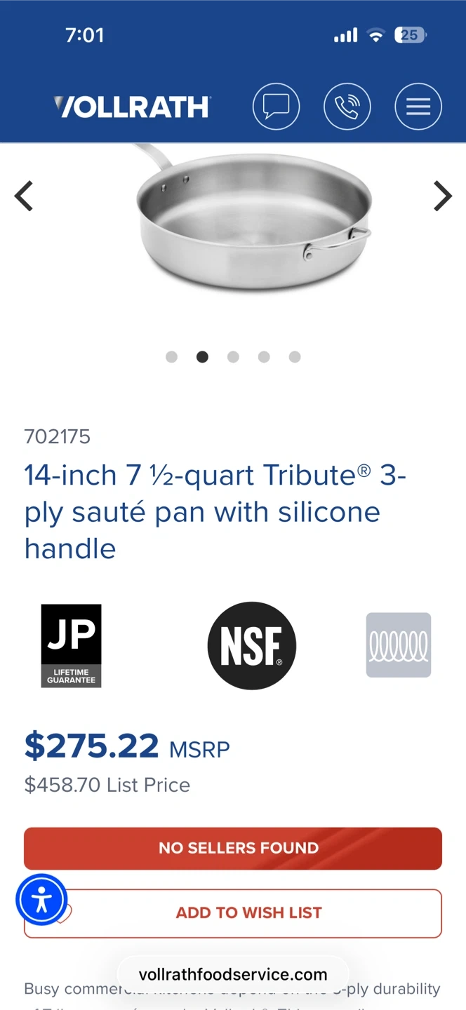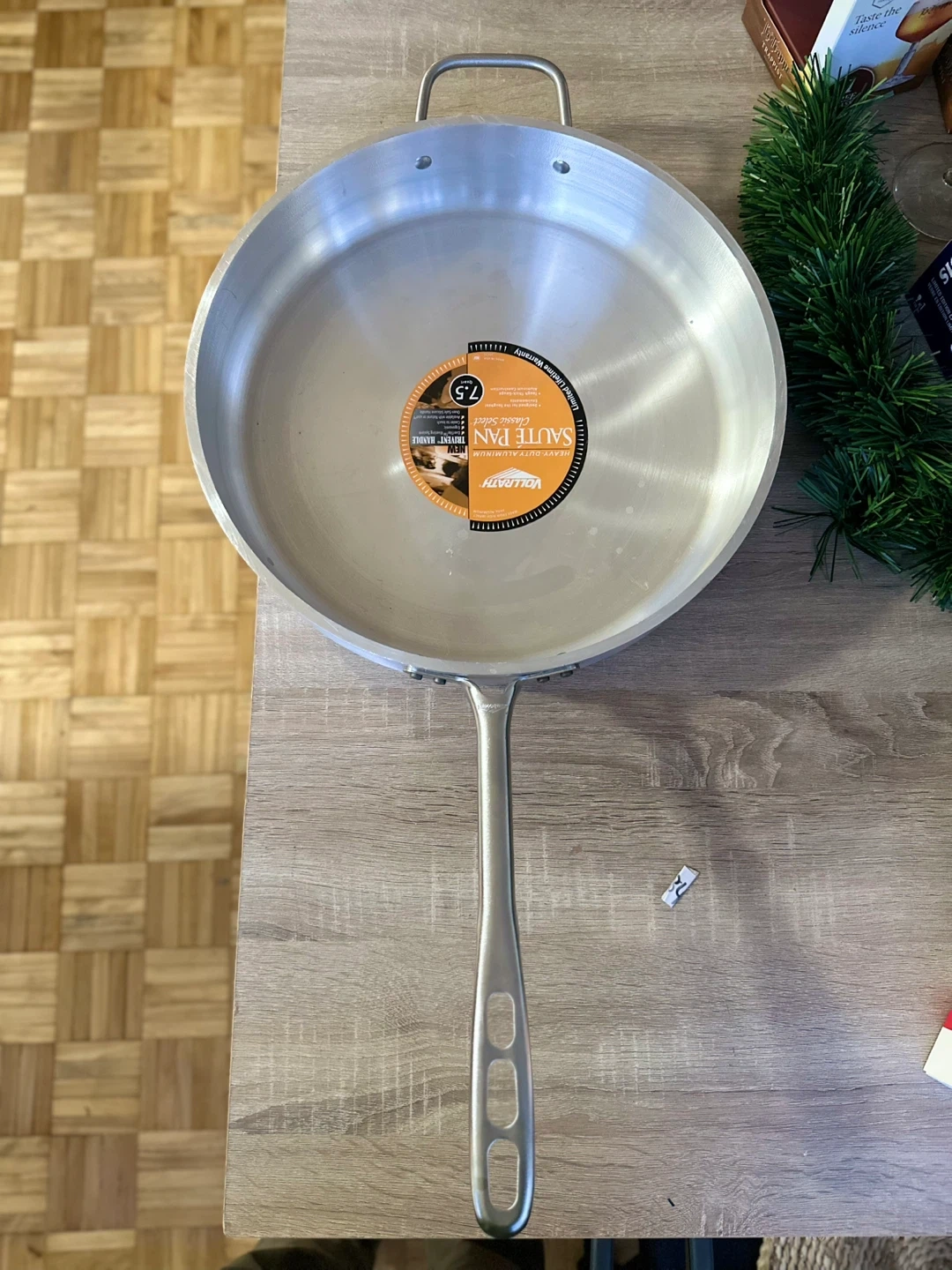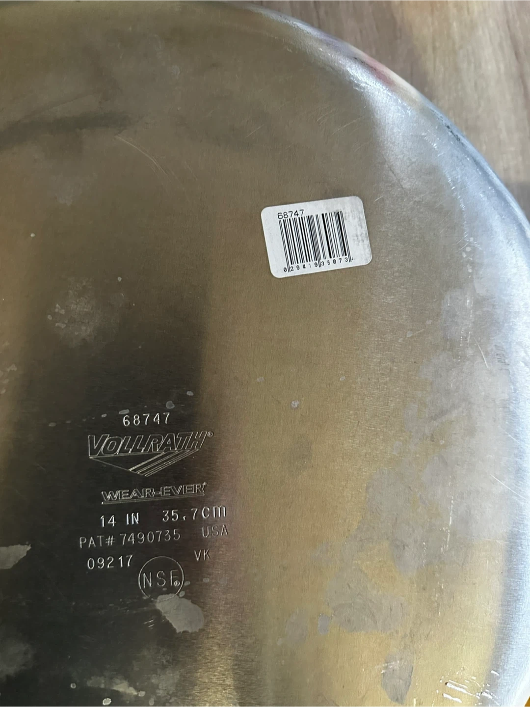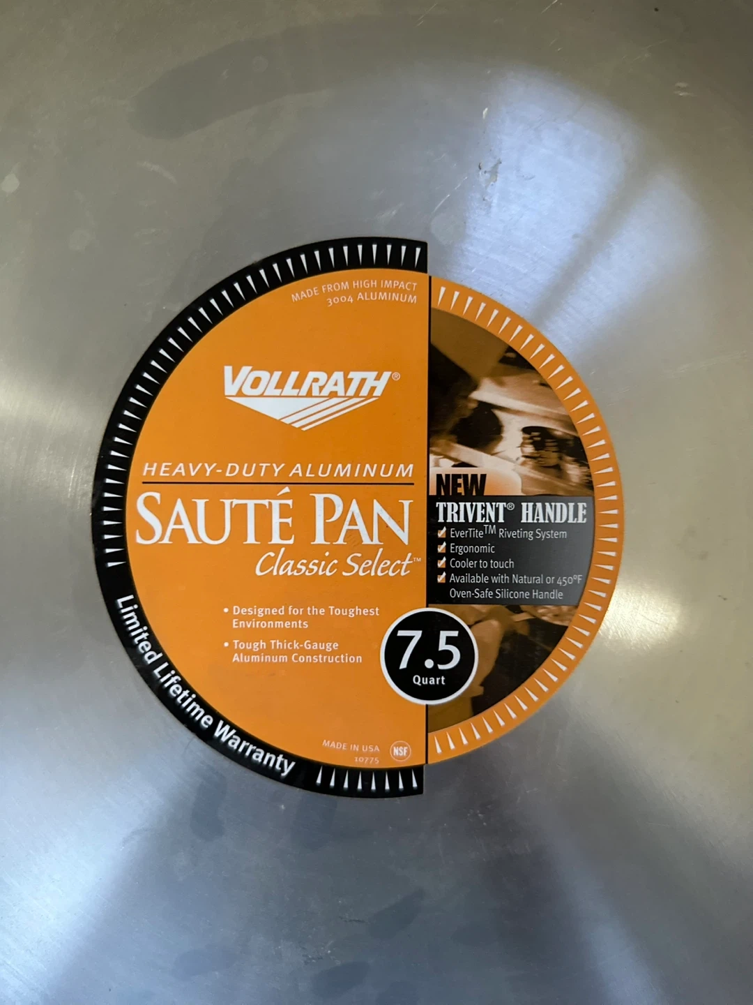 This is a Vollrath 14-inch heavy-duty aluminum sauté pan. It has a 7.5 quart capacity and a classic select tri-vent handle. Made from high impact 3004 aluminum. It's designed for tough environments.