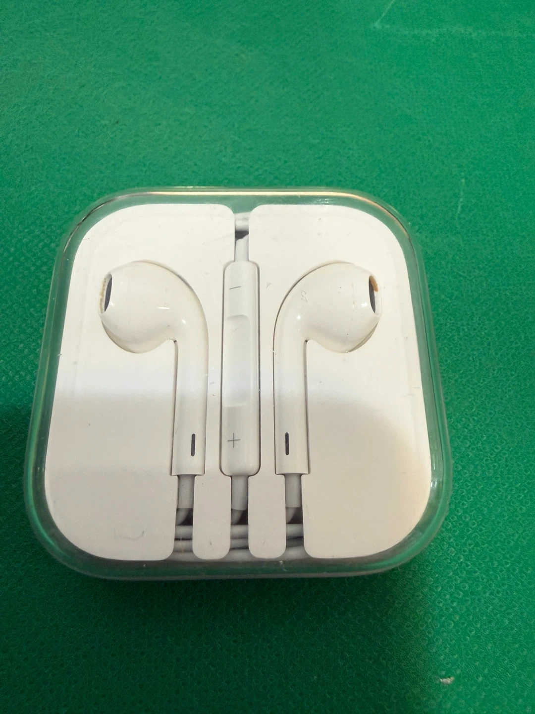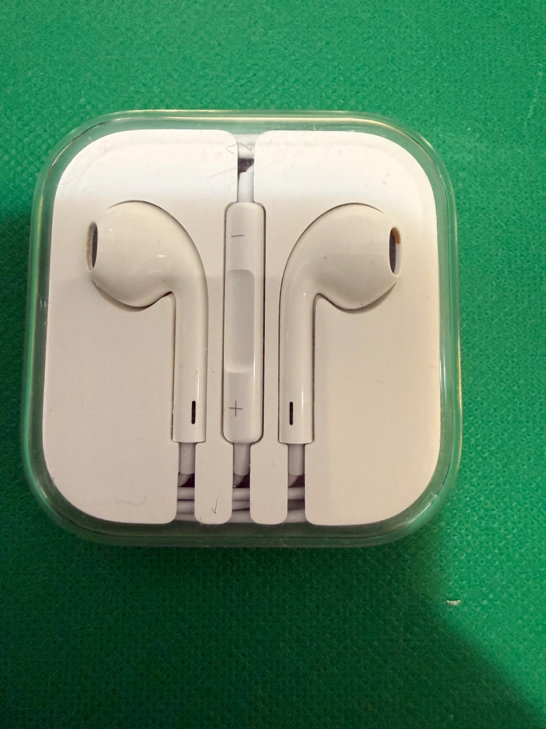 White Apple EarPods with Lightning Connector. Comes in a clear plastic case. Includes in-line remote for volume and playback control.