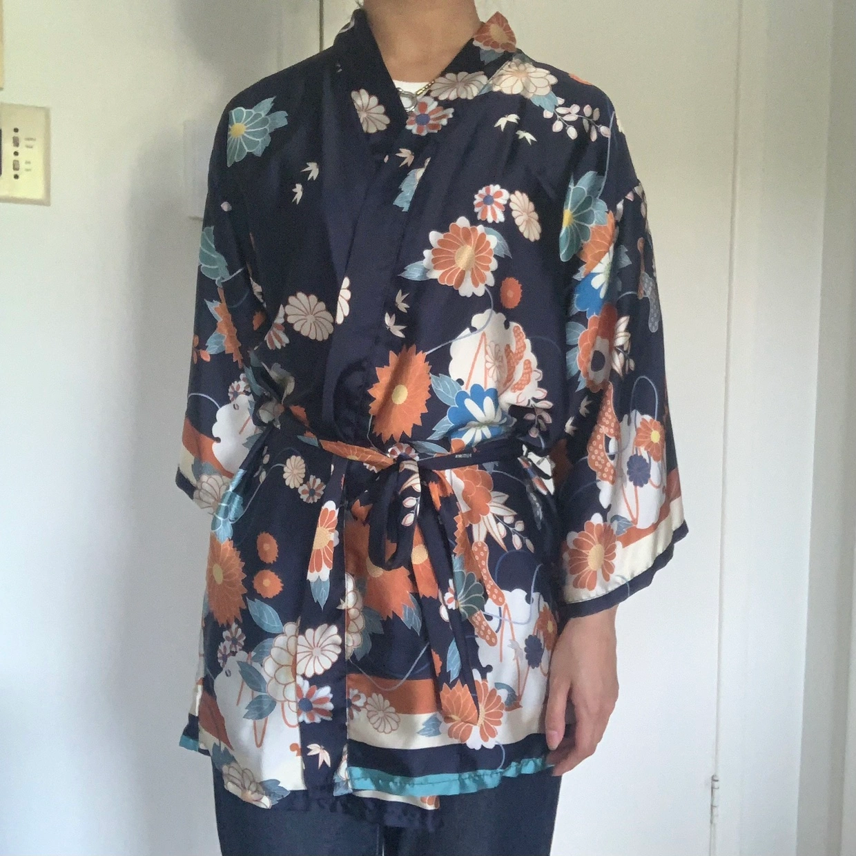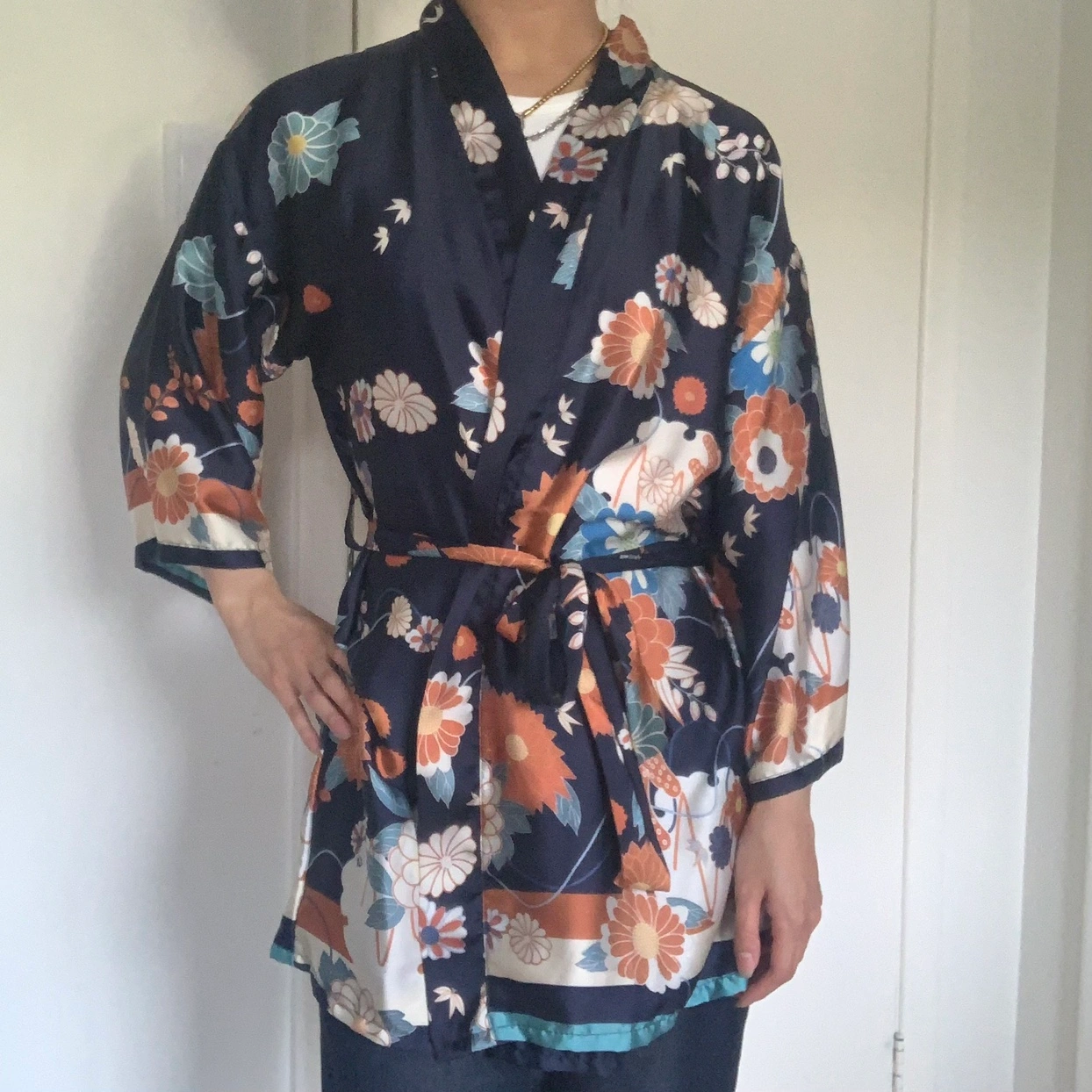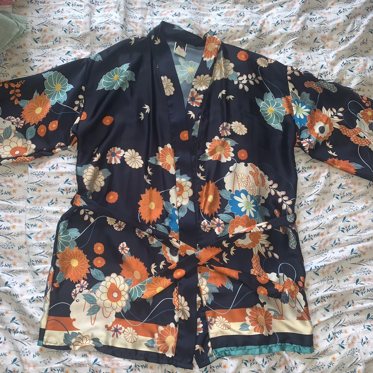 Beautiful floral kimono robe with a navy base. Features a tie belt and long sleeves.