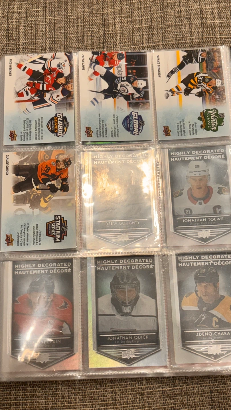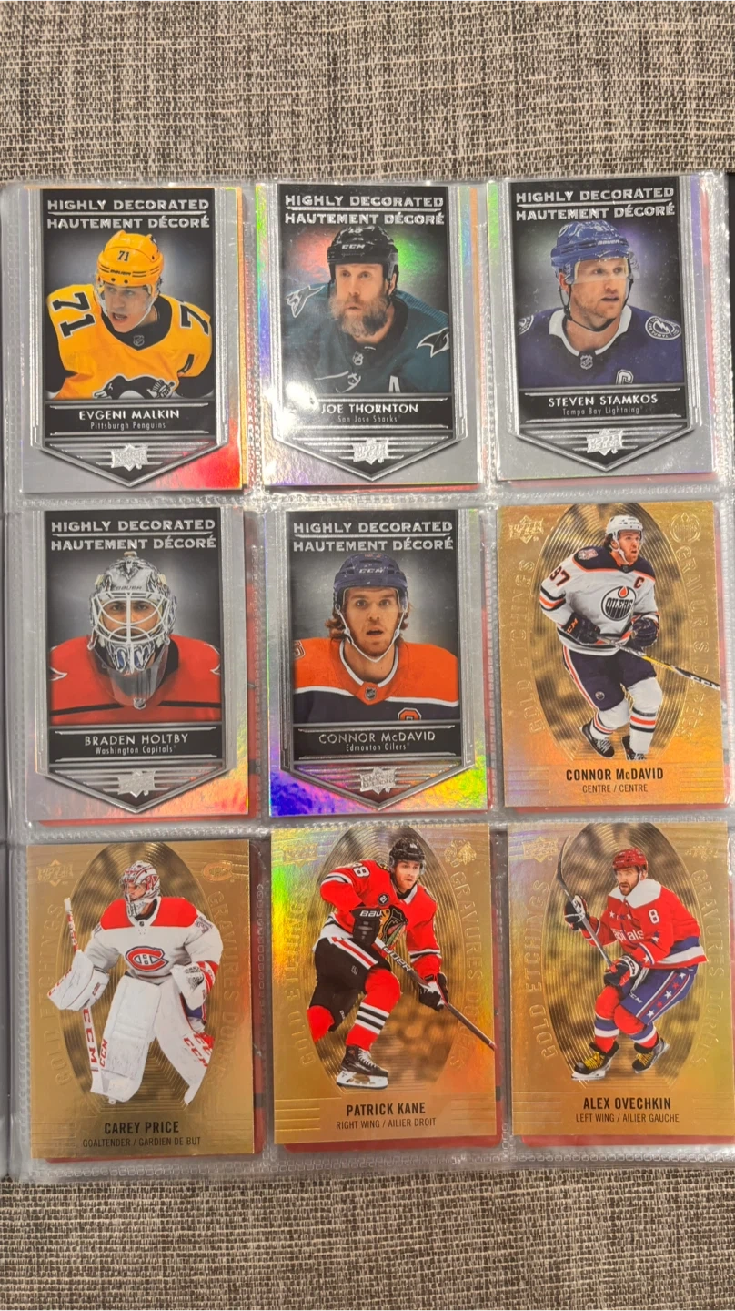 Collection of Upper Deck hockey cards featuring various NHL players. Includes rookie cards, inserts, and special editions. Great for any hockey card collector!