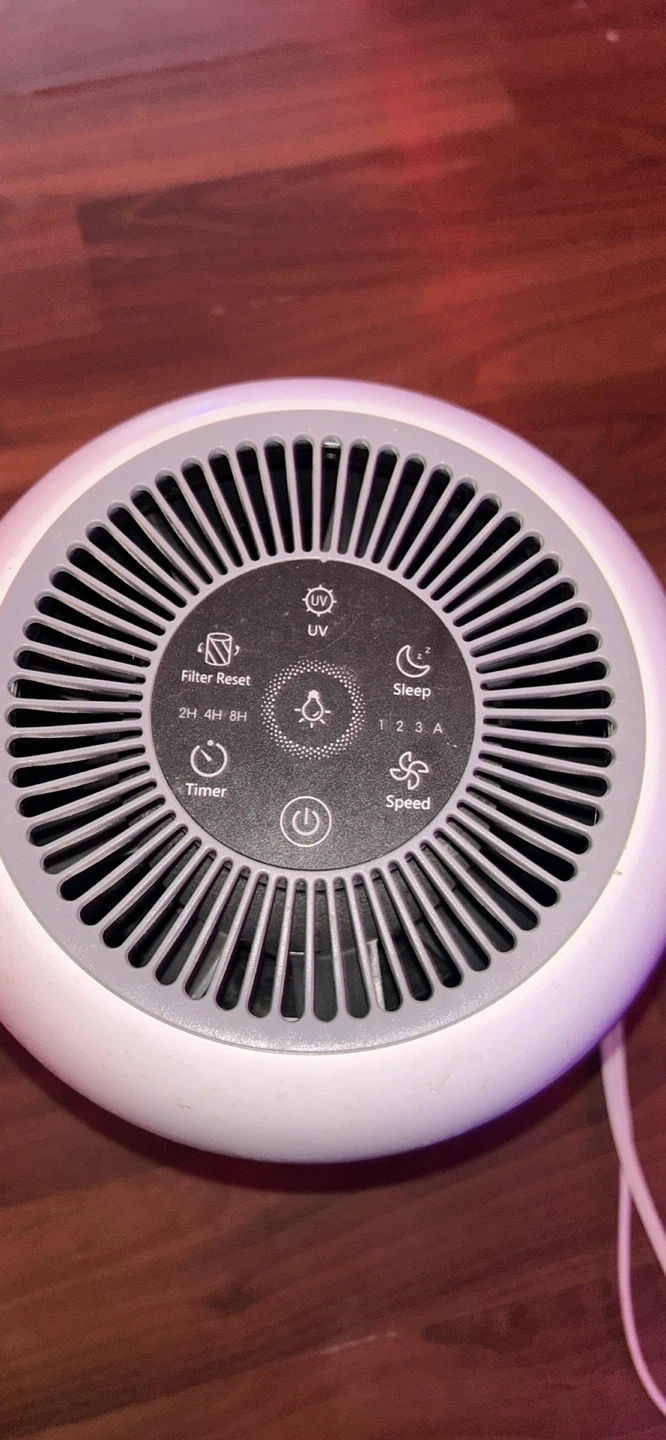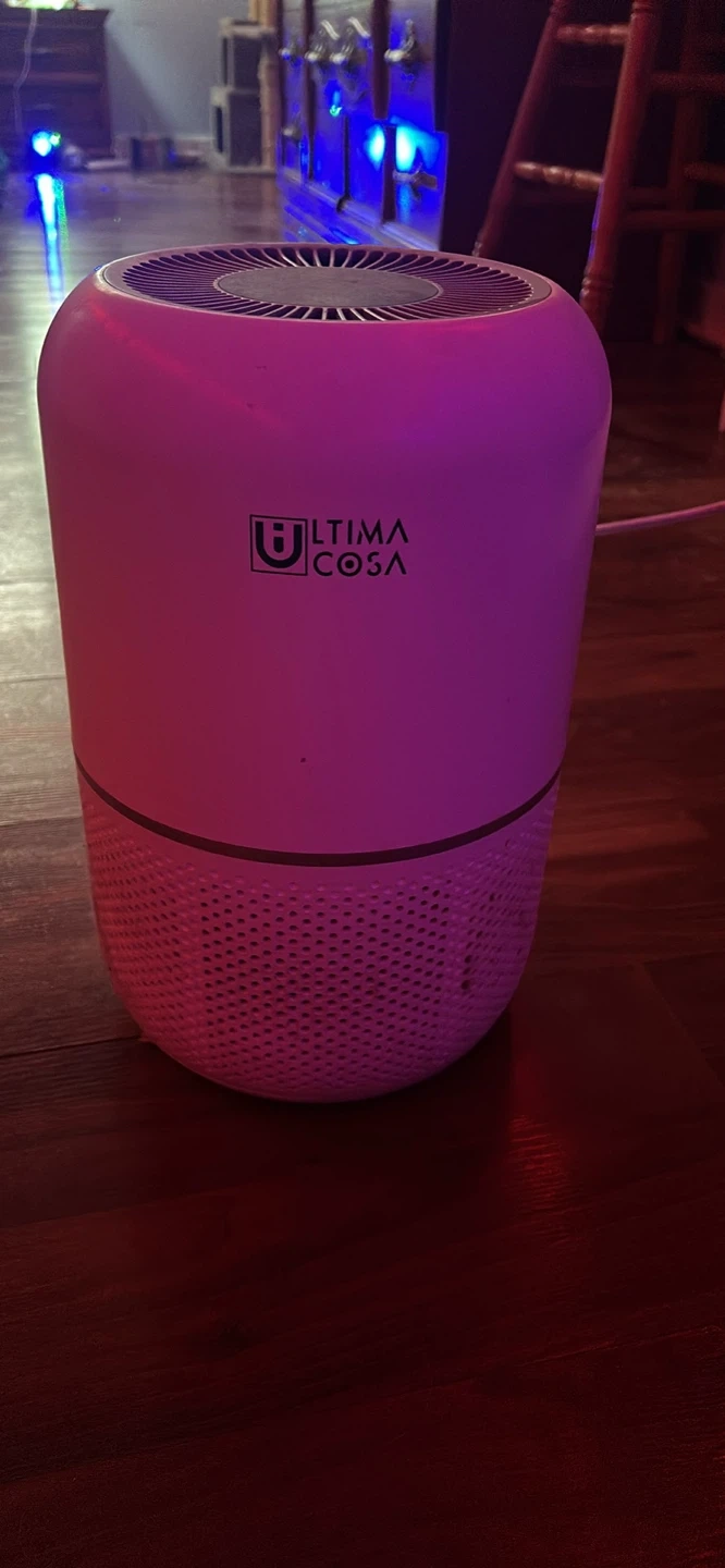 Ultima Cosa air purifier featuring UV light, sleep mode, and adjustable speed settings. Includes a timer with 2, 4, and 8-hour options. Filter reset indicator light is present.