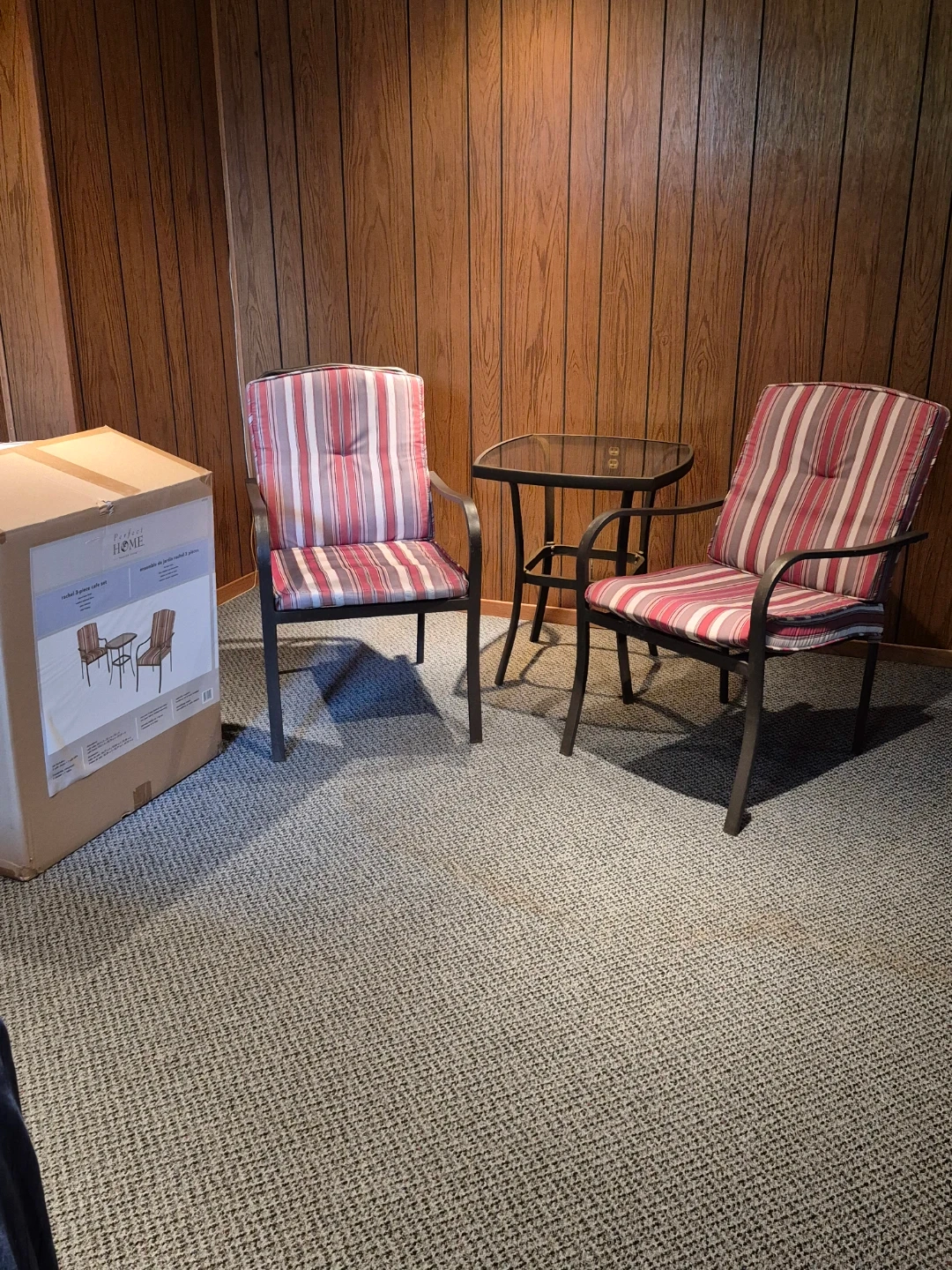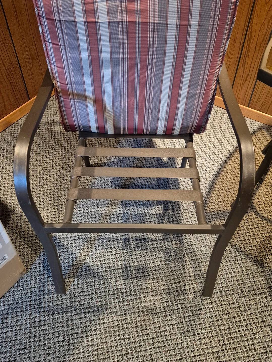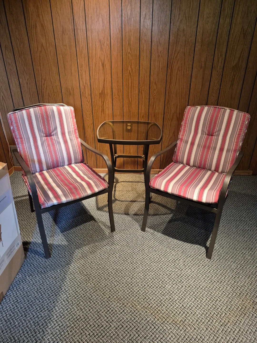 β The chairs have metal frames, striped cushions, and are nice and comfortable.