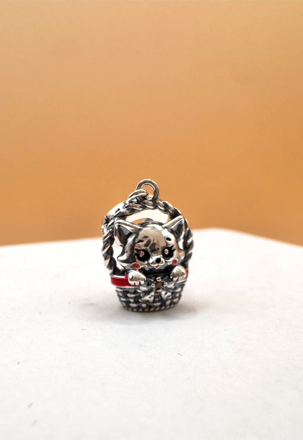 This is a charming sterling silver pendant featuring a cute cat peeking out of a basket. It's detailed with a red accent band on the basket. It's a sweet addition for any charm bracelet or necklace collection!