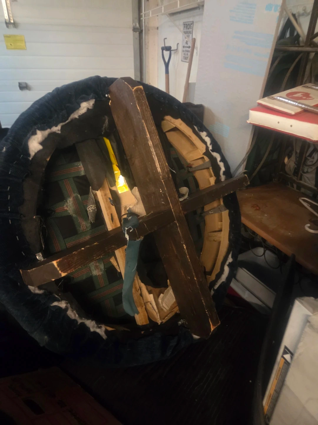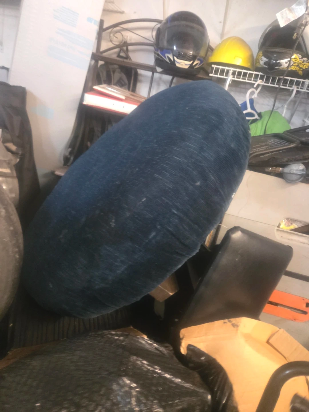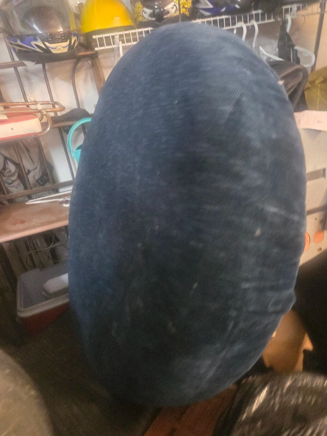 This blue fabric ottoman is a nice addition to any room. It's upholstered in a dark blue textured fabric. The interior shows its sturdy wooden frame and construction.